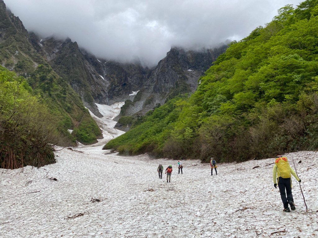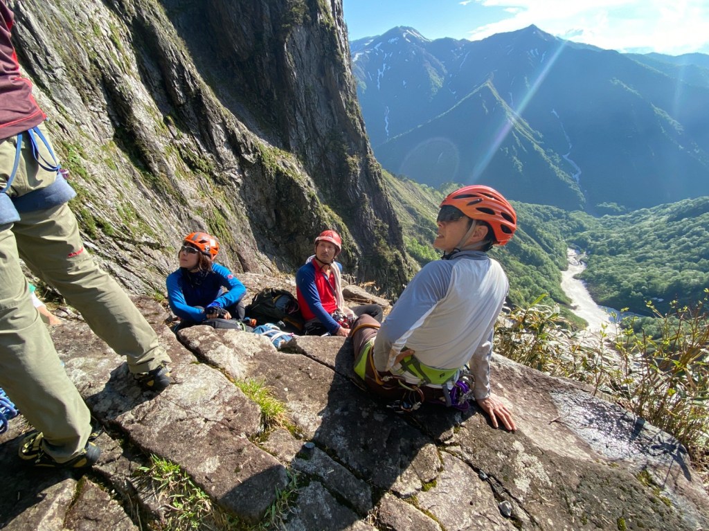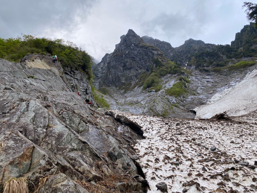 (山宮)昨年同様今年も山岳会山行で一ノ倉沢烏帽子沢奥壁南稜へ行く計画を立てたところ参加人数が昨年の2人から9人と大幅に増加しました。前日まで天気予報は二転三転して決行する判断が難しく日曜へのスライドも視野に入れながらみなかみの天気と湯沢の天気をチェックし検討していましたが金曜の朝の段階で予定通りに決行することにしました。土曜日は移動途中の湯沢町で霧雨で嫌な感じがしましたが関越トンネルを抜けると雨は降ってませんでした。ベースプラザ出発前に天気予報を確認すると終日晴れ予報が昼から曇りで15時過ぎから曇り/雨に変わっていました。天気予報が変わっていること、朝一は昨日の雨でまだ岩が濡れているはずだけどそれも谷川アルパインっぽいので問題ないということ、駐車場にほぼ車が止まってないので核心となると思われた先行パーティー待ちの渋滞は無いだろうということをメンバー全員に伝えて予定通りに登って雨に降られる前に一ノ倉沢出合まで下りてきましょうと出発しました。初谷川アルパインの土田さん、大村さん、長谷川さん、南稜初完登の銅谷さんにとっては最高のコンディションでの山行とは言えなかったと思いますが、谷川っぽさを経験できたのは良かったと思います。最後尾から登攀して思ったことは皆さんまだまだ支点構築や登攀のスピード、懸垂下降のスピードが遅いと感じました。(登攀も懸垂も終了点で必ず先行パーティーがはけるまでの待ちが発生しました。)もっと練習してもっと経験を積んでスピーディーに登れるようになってもらいたいです。多少の問題もありましたが参加メンバー全員が無事に下山することができて良かったです。個人的には3回目の南稜でしたが余裕を持って登れました。ただ、上に書いたとおり最終ピッチの最後の一手でフォールしたことは正直残念でした。岩が濡れててもA0無しオールフリーで登れないとね・・・精進します。