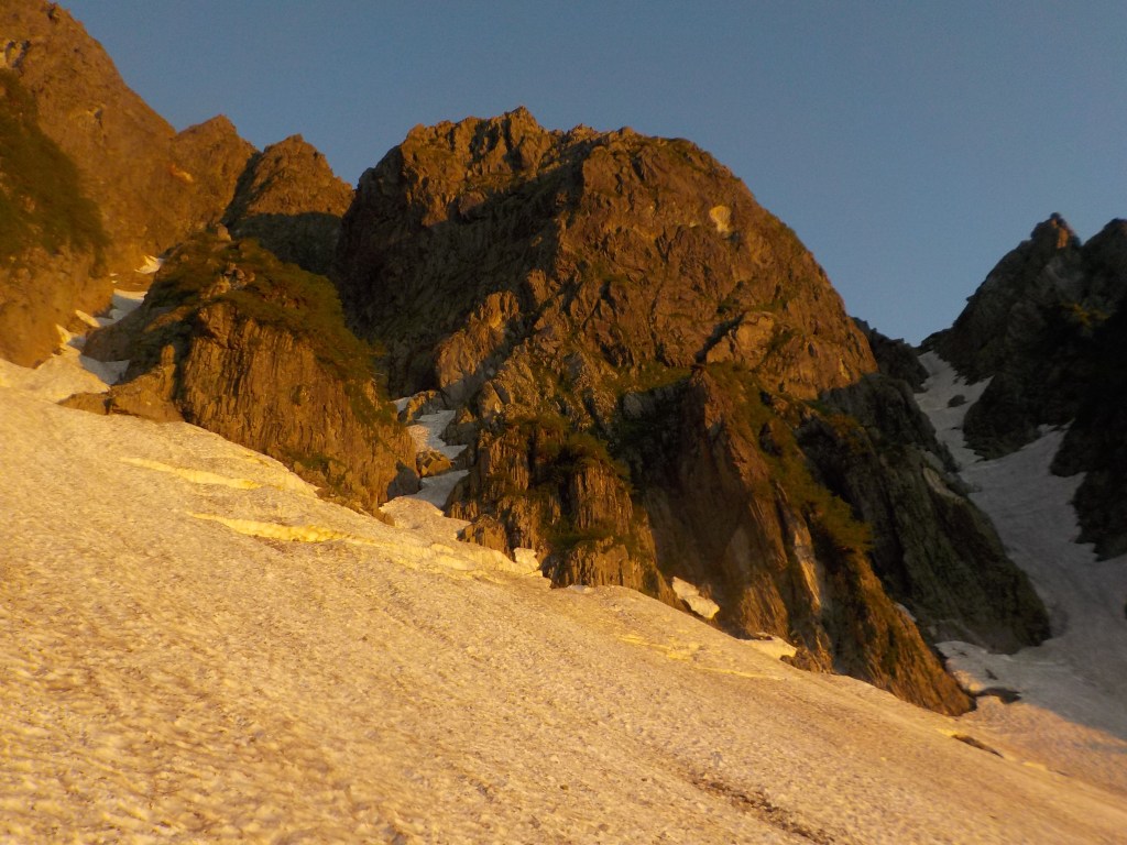 ・5・6のコルからガレた沢を落石に気をつけて下降し途中で右へ横断し小尾根に乗りそこから踏み跡を右へ横断し尾根に上がります。そこから踏み跡を辿り夏道を下ってもよし雪渓に乗って雪渓を下ってもよし好きな方をどうぞ。(今回は夏道を下りました。)