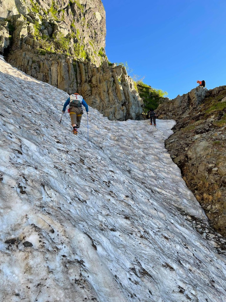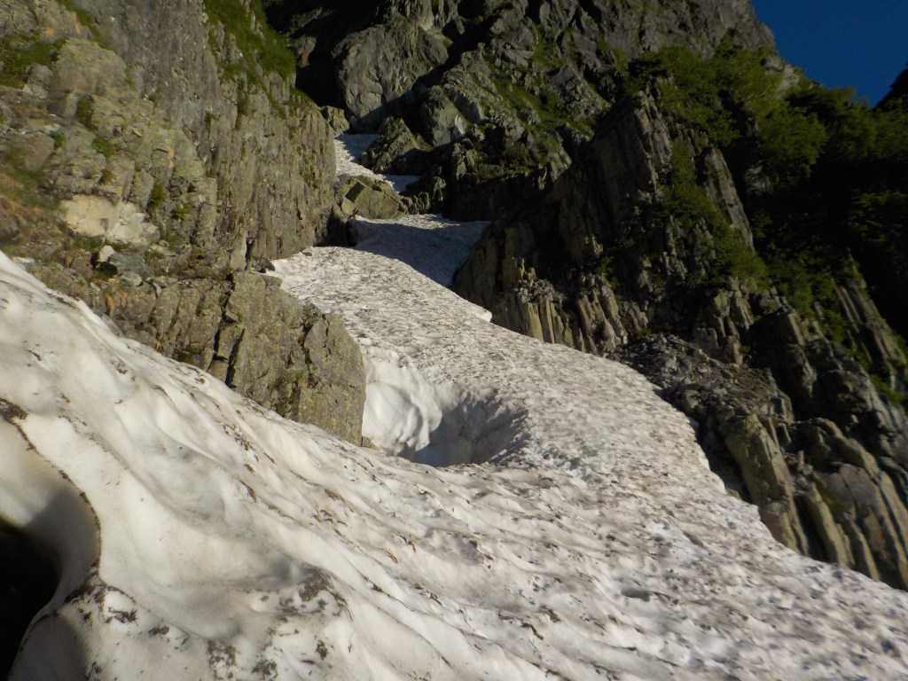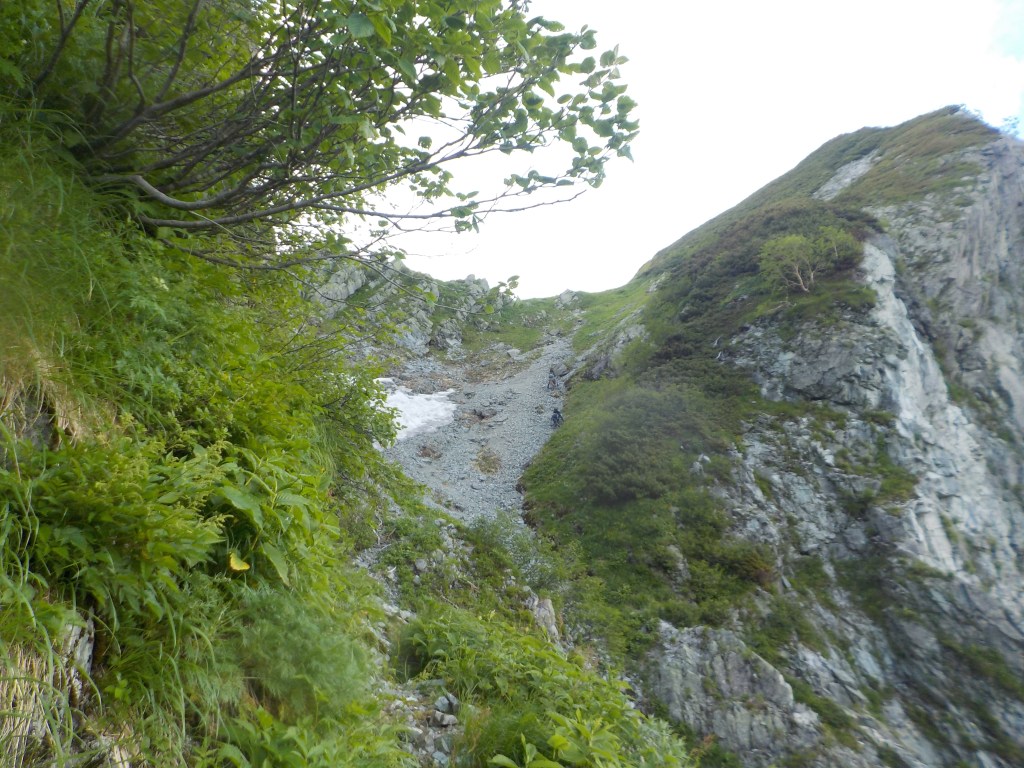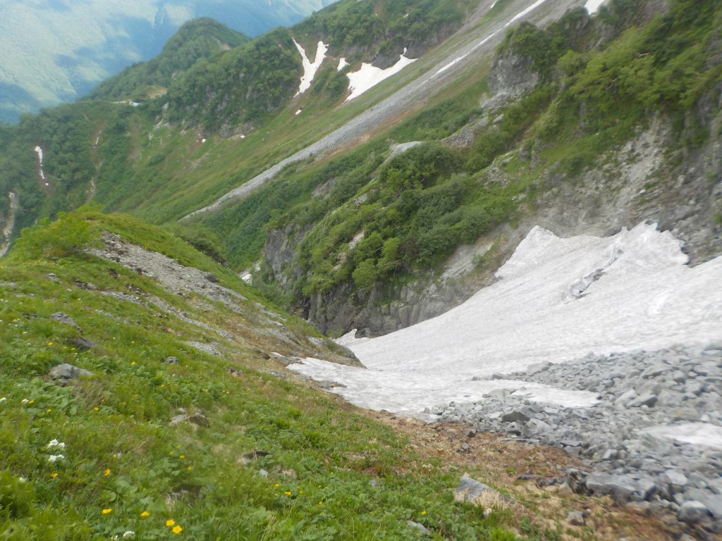 ・夏道から沢に降りると沢はかなりザレているので落石に気をつけ間隔を取って下降し途中で雪渓の残る沢をアイゼンを装着して横断しました。その後、草付を横断するともうひとつ雪渓があるので横断しA沢に到着します。