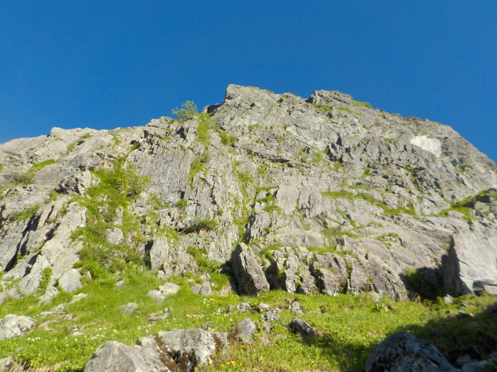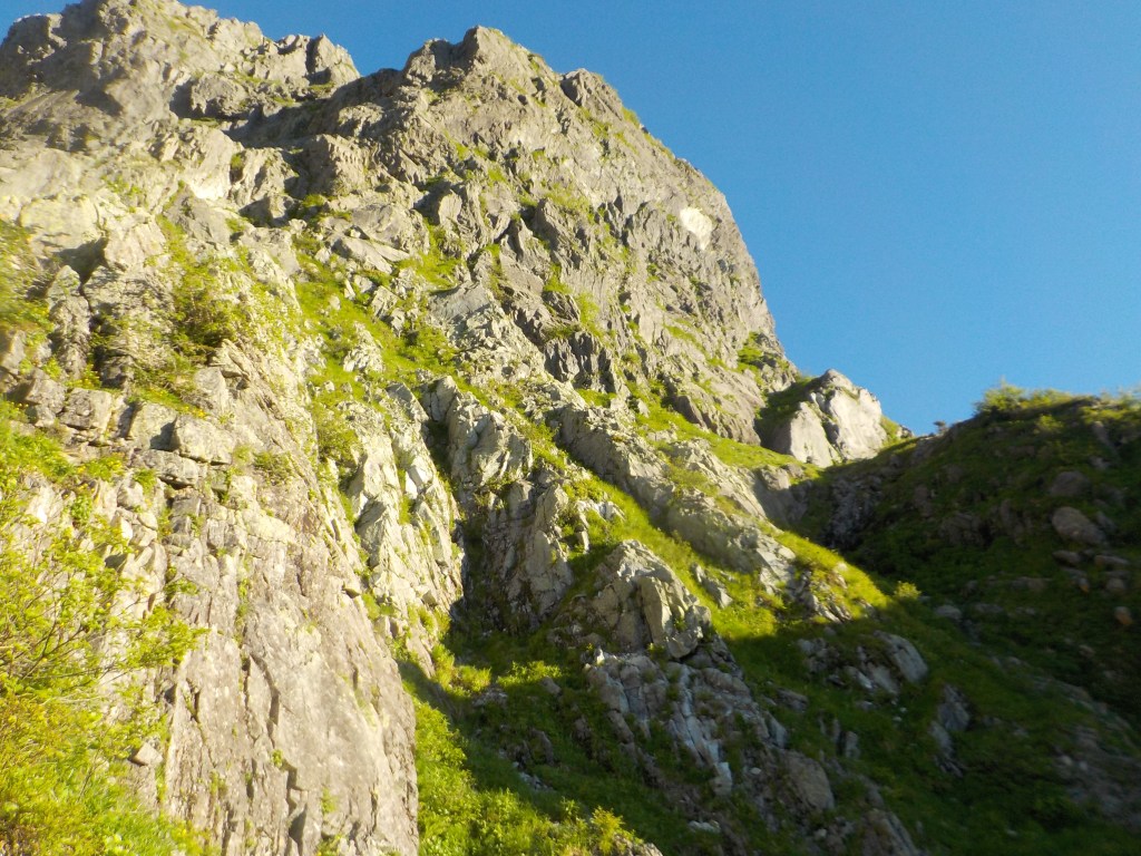 ・中畠新道分岐から見える松高ルンゼ右の尾根の中畠新道を登っていく。岩壁を左側から右上する感じで取付く。(右上途中に緑色のレリーフがある。)