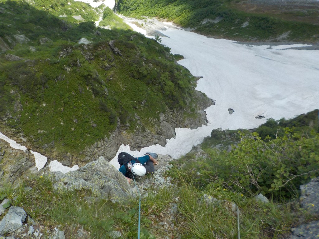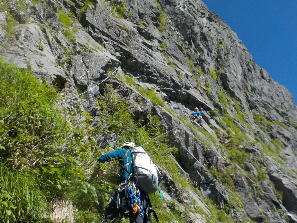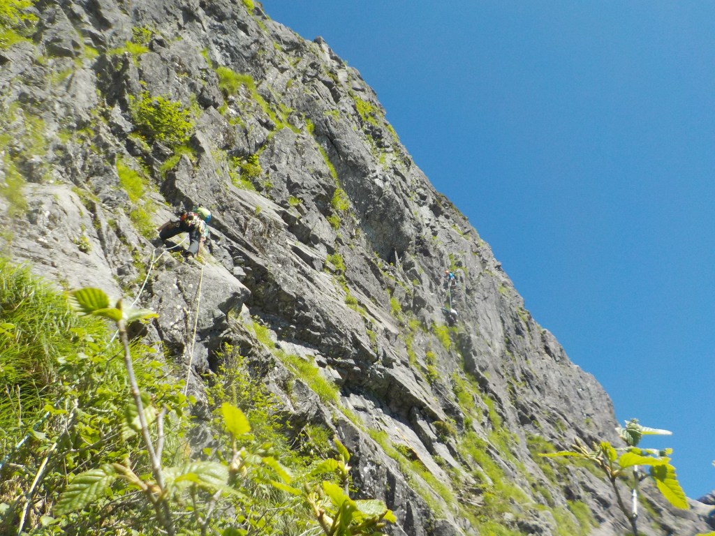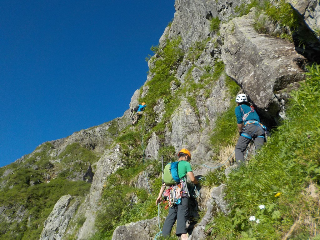 1P 取付支点から左へ回り込んで草付を登る Ⅲ(リード:Mさん、Oさん)