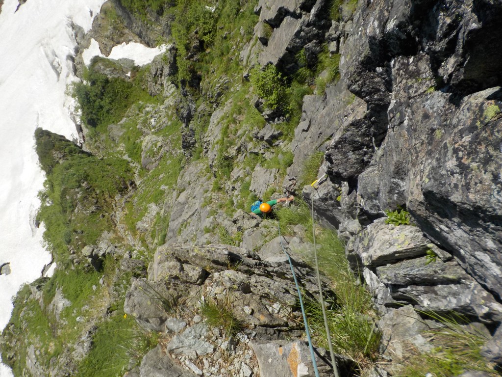 ・このピッチは垂直のフェイスに乗りあがるところ岩や左の凹状部へ移動するところの岩が非常に脆かったです。(落石注意!!)