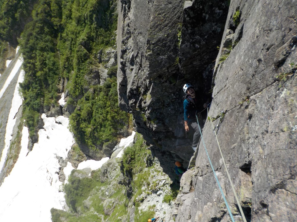 ・トポの「1~3P 100m T1から左へ回り込み凹状部を登る Ⅲ~Ⅳ」となっていましたが、このピッチの出だしのフェイスは明らかにⅢ~Ⅳのグレードではなかったです。