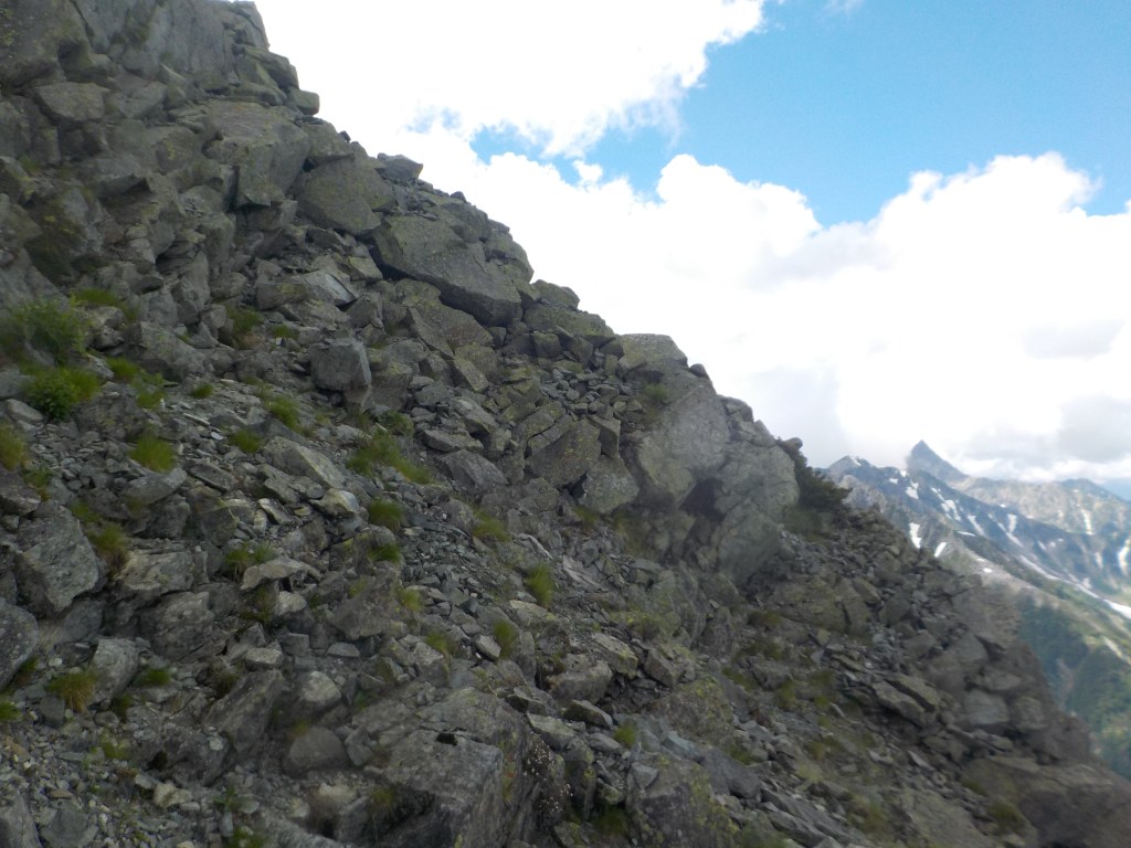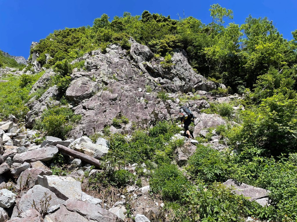 ・7P終了点から少し右へ移動し凹状を適当に登る。その後も岩の部分を適当に登っていき最後はハイマツを漕いでルンゼに出て終了。