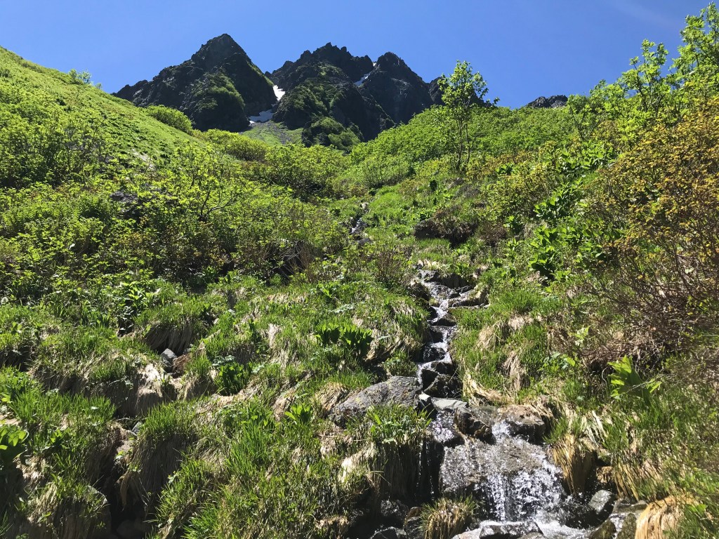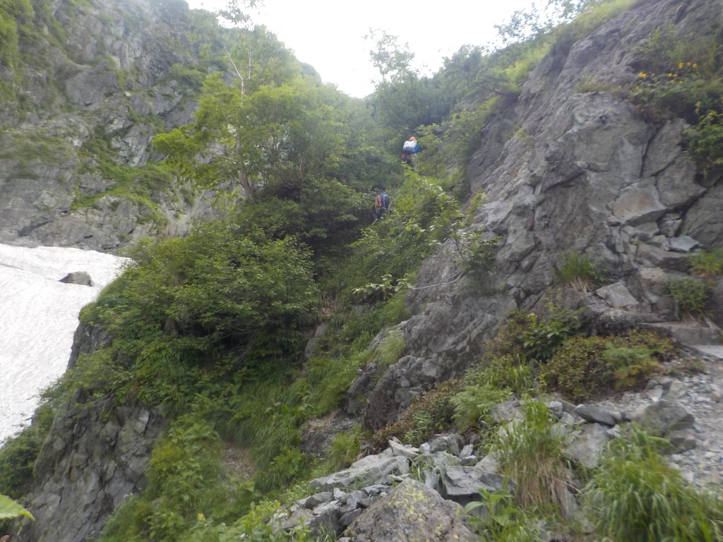 ・中畠新道の尾根上は繫茂した草木がうるさい感じですが途中まで一本道なので迷わず登れます。途中にスラブっぽいルンゼが出てきてそれを右側から登っていくと道が三つに分かれます。左はスラブっぽいルンゼがそのまま続いてる道で後半は藪漕ぎになります。(OさんとMさんはこの道を選択し登ってました。)真ん中はスラブからの枝沢のような感じで枯れたゴーロの沢です。(Oさん山宮は下山途中にこの道に入り込んで下山しました。)右は普通の登山道で踏み跡もあります。途中に雪渓が残っている岩がゴロゴロしたところに出ますが左上のほうにテープがありそこから上を目指せば明瞭な踏み跡に合流します。(山宮とSさんはこの道を使って登りました。)