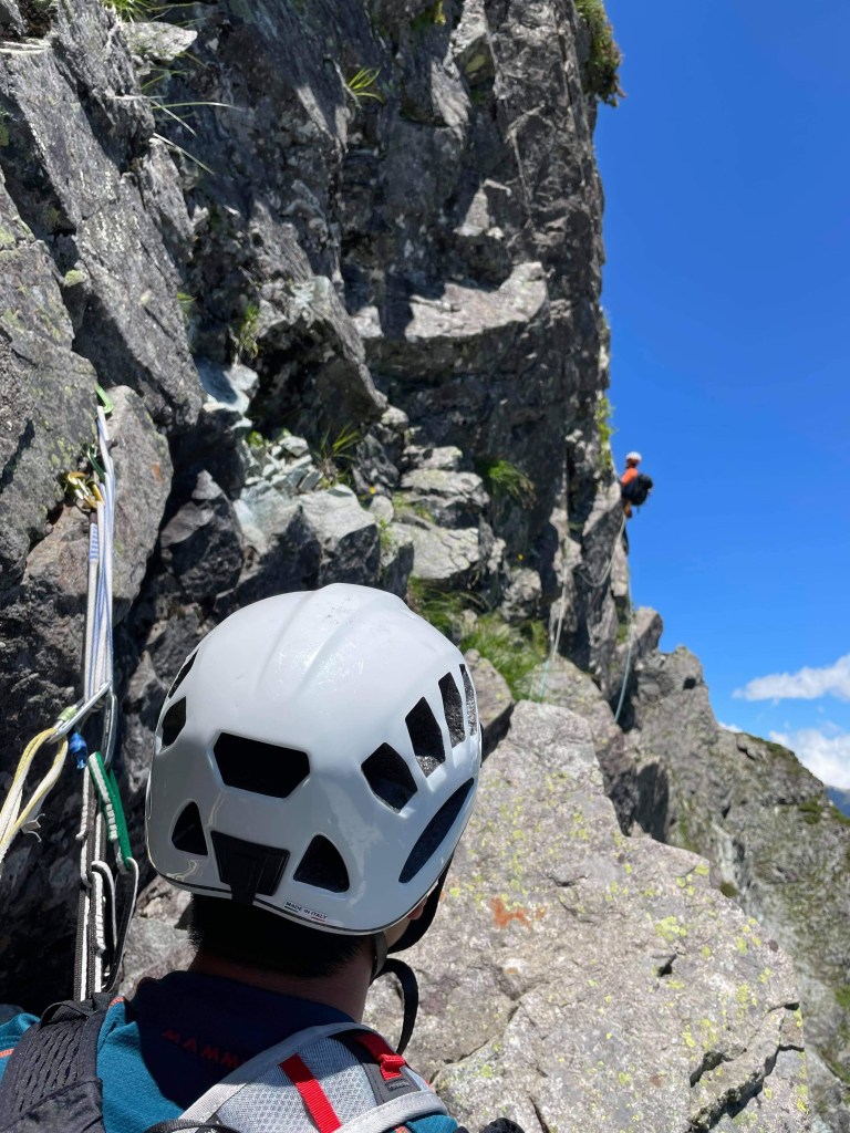 ・トポの「1~3P 100m T1から左へ回り込み凹状部を登る Ⅲ~Ⅳ」となっている区間はどこを登っても最後はハイマツテラスに行けると思うので好きなところを登ればいいと思います(笑)下山後にネットの記録を確認してみましたがトポ通りに3Pで登ると1P目は草付混じりのガリーで岩が脆く支点がほとんど無いみたいです。1P目はこのガリーの右のフェイスを登っている記録もあります。2P目はクラックのある凹角からガリーを登るようです。3P目は今回登った4~5P目と一緒だと思います。