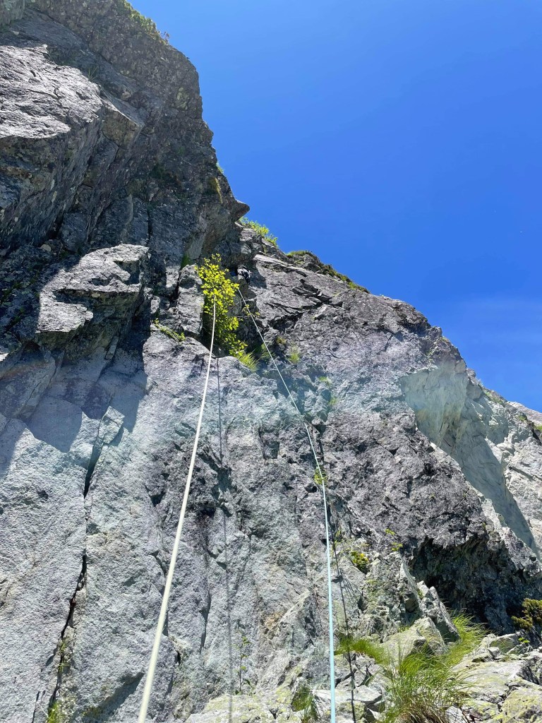 ・凹状部を25mぐらい登ったところにある残置支点でMさんがピッチを切ったので山宮もそこでピッチを切りましたがハイマツテラスにある終了点まであと10m程度なので上まで繋げて登ったほうが良いです。