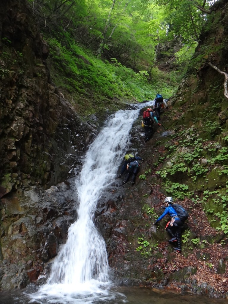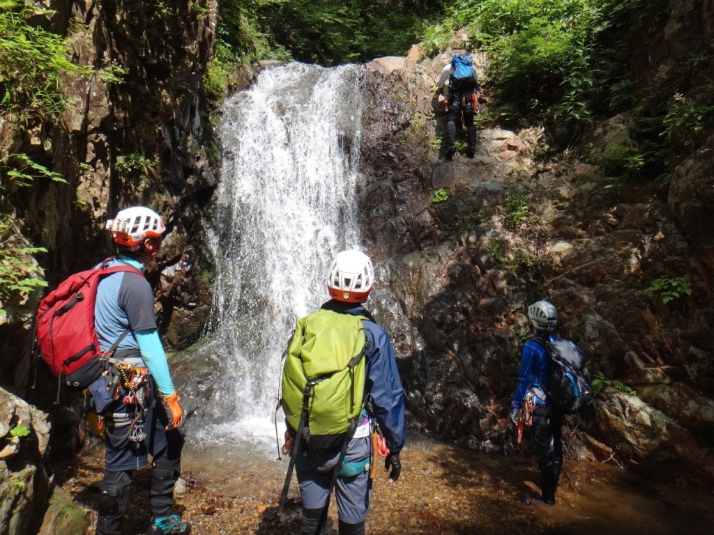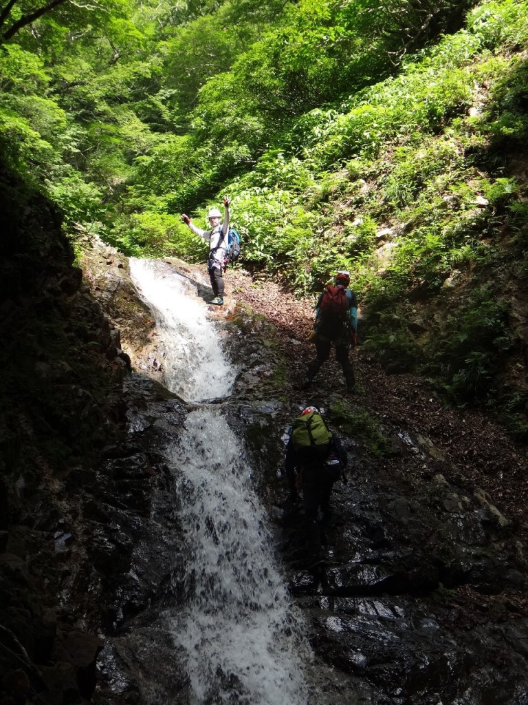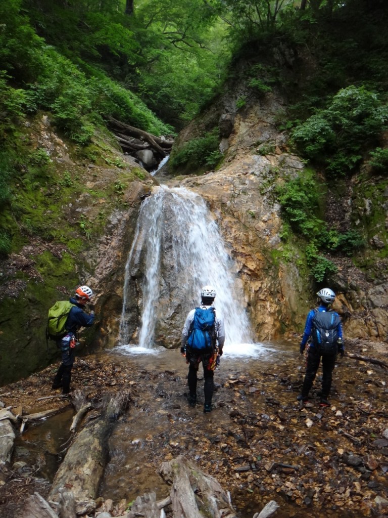 (神蔵)チームワークが素晴らしくサクサク遡行できました。次々に出てくる滝も手堅いサポートのおかげで安心安全に登攀でき楽しい沢登りでした。今回は沢でのロープワーク実践を間近で見ることができとても勉強になりました。登攀系の沢登りも今後少しずつ経験を積んでいきたいです。