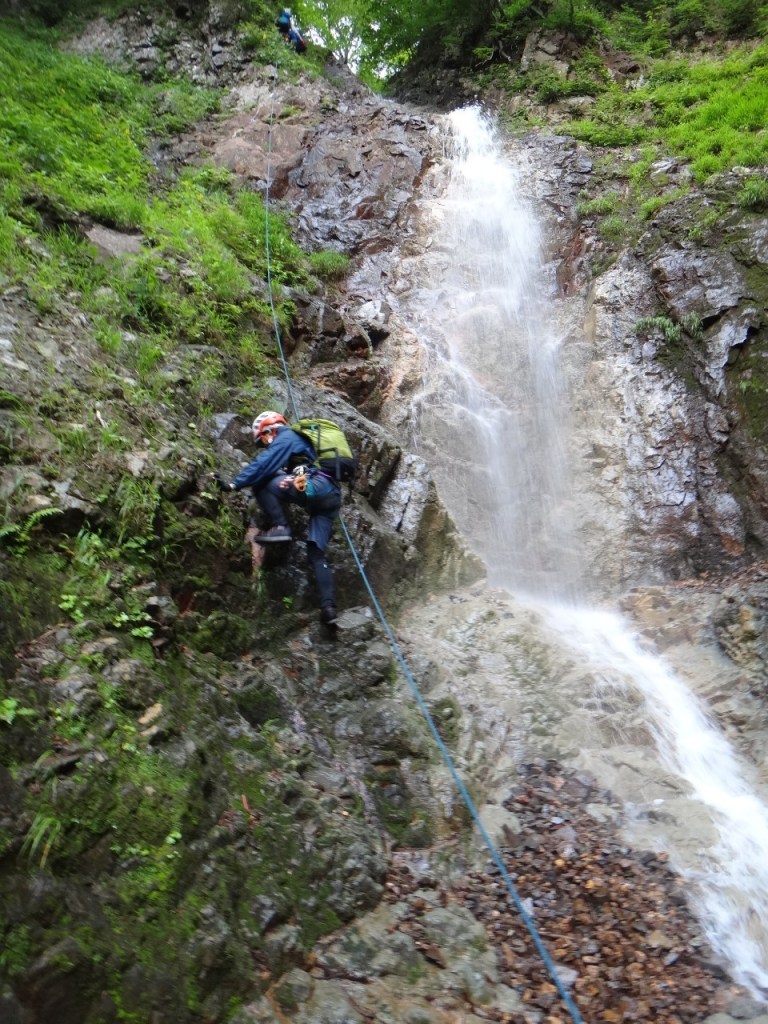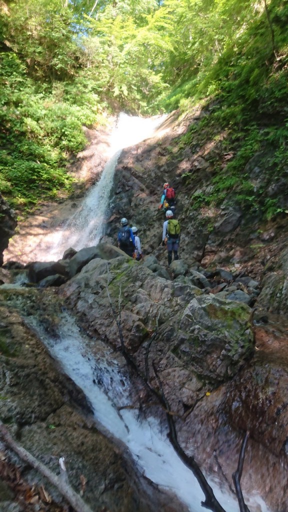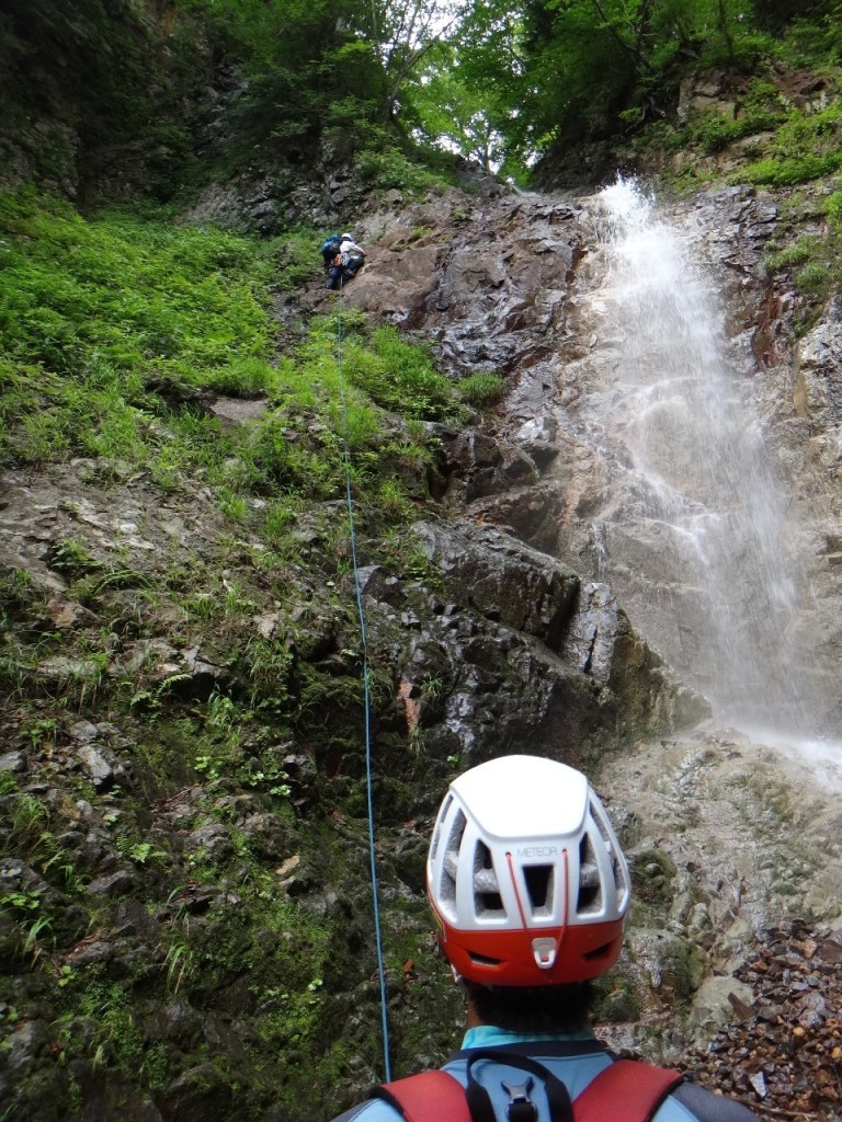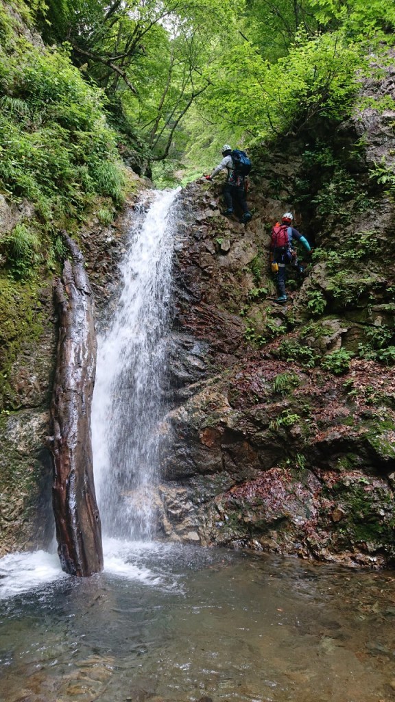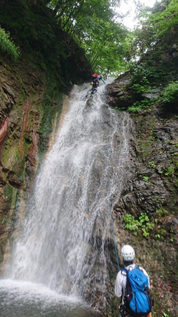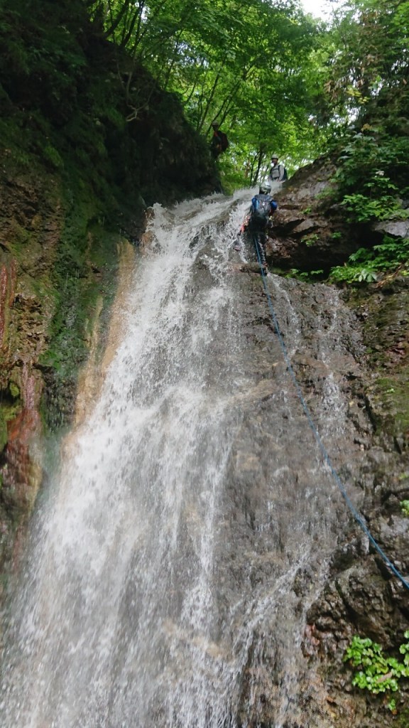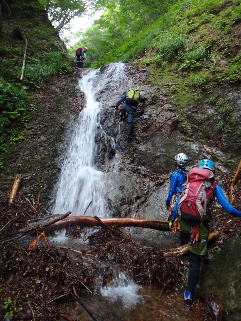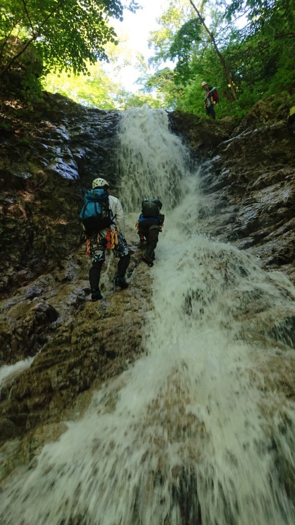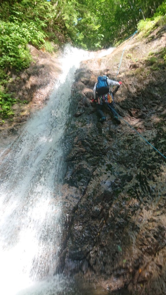 ・ロープを使って登った滝はF2、F3、F9の3本。(F2とF3は山宮リード。F9は進藤みリード。中間者はタイブロック又はマイクロトラクションを使ってのプルージック登攀、最後尾はフォローで登攀。)