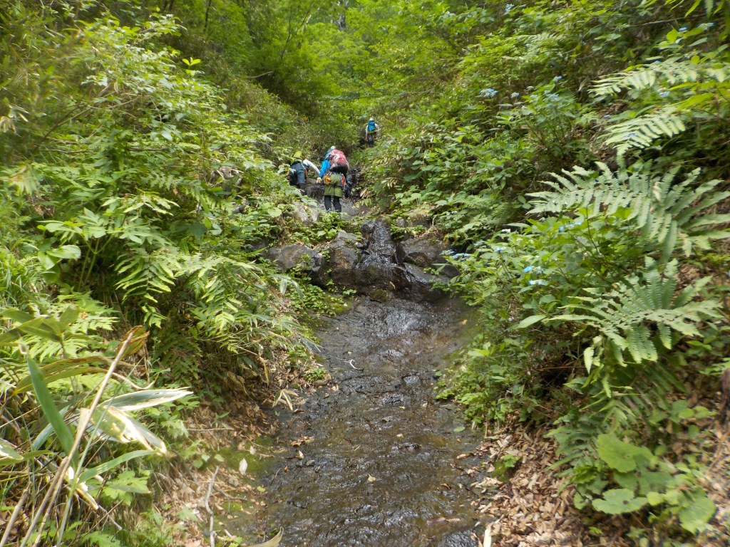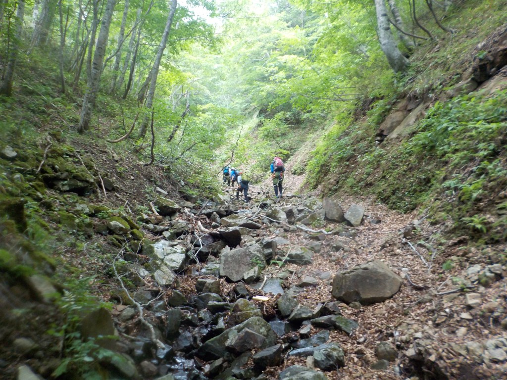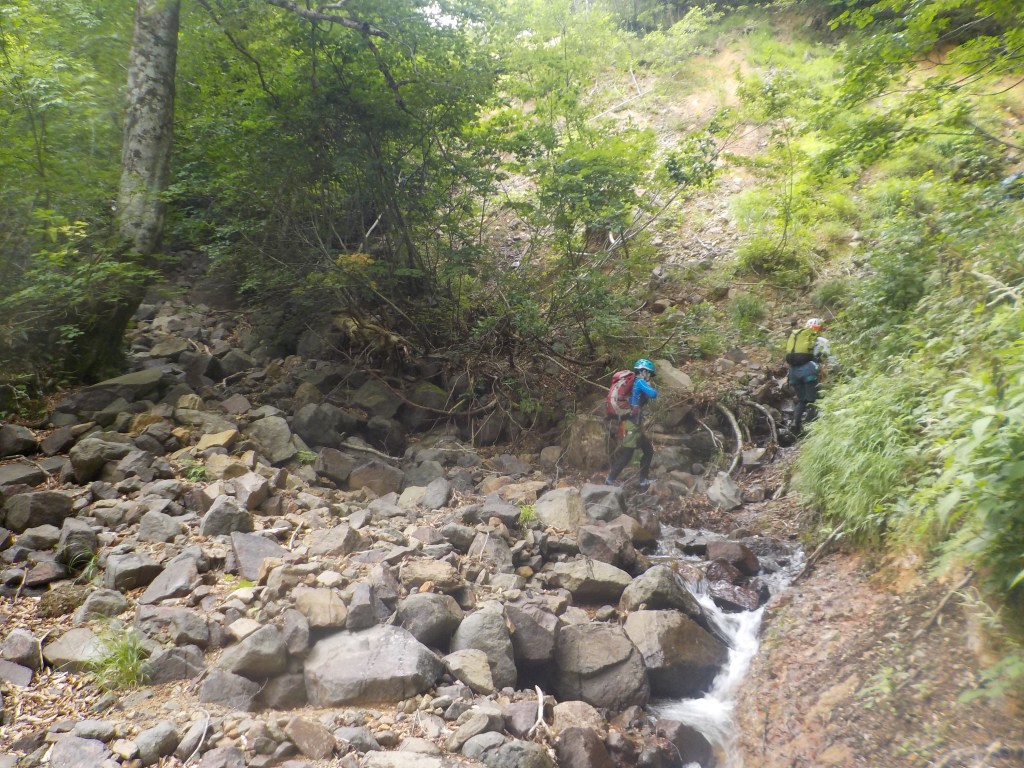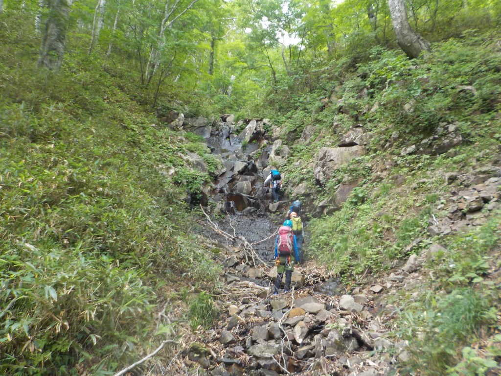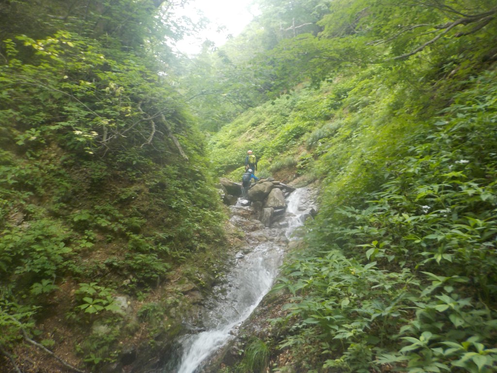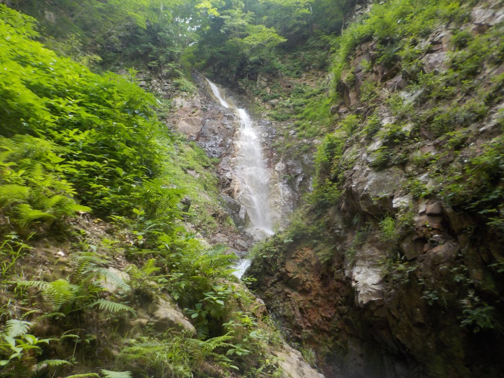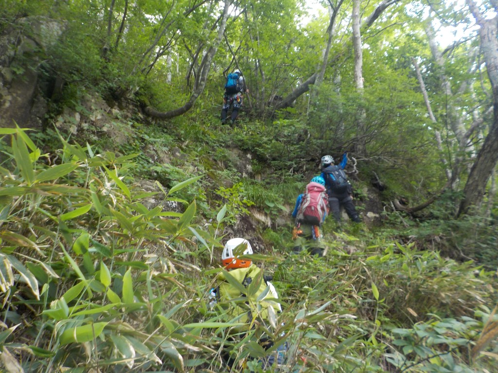 (進藤ま)連休最終日、本来であれば「井戸小屋沢」へ行く予定でしたが・・・天気予報等を考慮して阿武隈川南沢右俣へ行って来ました。ネット等で調べると快適に登れる大きな沢が次々と出てくる登攀系の沢とあります。実際「えぇ~こんな大きな滝登れるの~?」っていう大きな滝が続々と出てくる沢でした。大きめ滝が10本ありましたがロープを出したのは3本であとはフリーでした。脆い岩もありヒヤッとしましたが今回も全てフォローだったので安全に楽しく登れる事ができました。最後の分岐を間違え少し山頂から離れてしまいましたがリカバリー出来て良かったです。