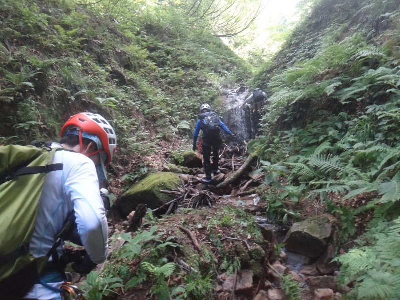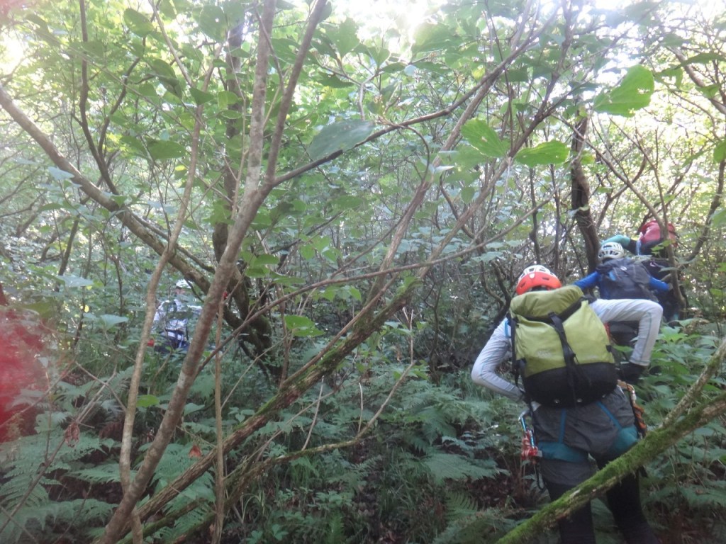 (山宮)今回はギリギリまで沢を詰めてから脱渓しましたが藪漕ぎはほぼ無く快適でした。今回はアブやブヨはほとんどいなかったので快適でしたが、藪化した登山道のアプローチでチャドクガにやられたみたいです。五頭の山の藪漕ぎは注意ですね!!(先日の小倉沢二ノ峰沢のときも最後の藪漕ぎでチャドクガにやられてます・・)ロープを出す滝を最近の進藤みさんは積極的にリードしてくれるので今回も「リードしますか?」と声をかけリードしてもらいました。また12m滝の最後の悪い巻きでも進藤みさんが先に登っていろいろ対応してました。頼りになるリーダーでした。西小倉沢は今回で3回目ですが核心以外の簡単なところはあんまり覚えてないものですねー。