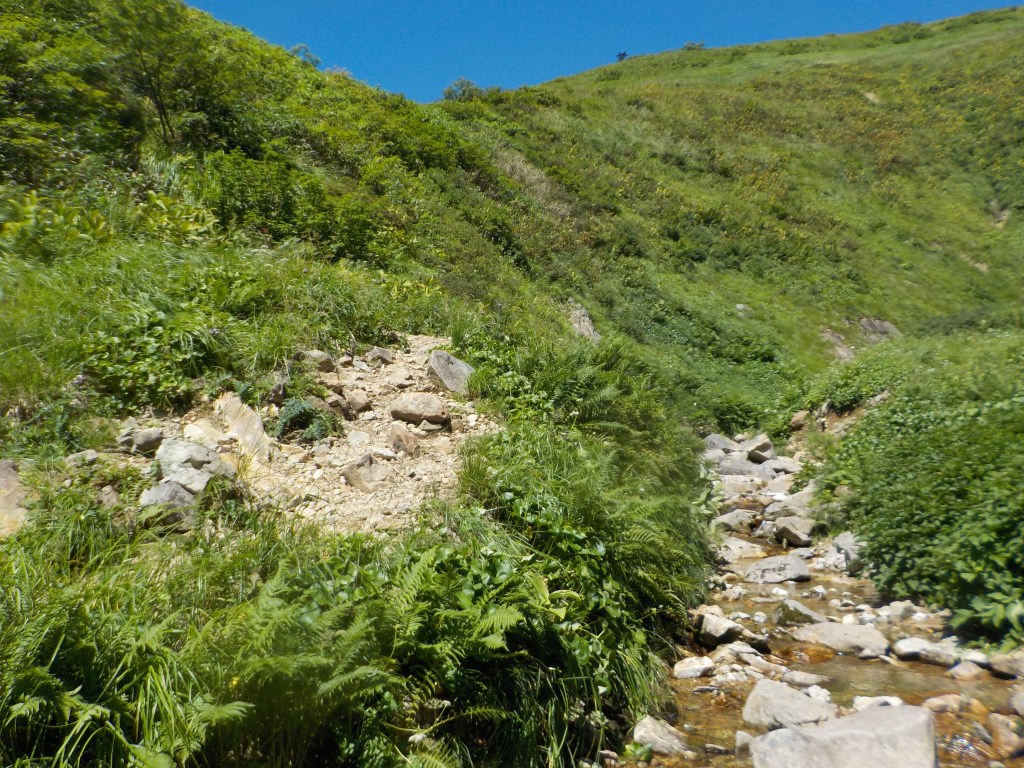(進藤ま)今回で2回目。最初の時の印象はゴーロ歩きが長い…と下山が長い…と言う微妙な記憶が…でも沢登り自体はとっても快適で楽しかった記憶があります。今回はラバーにしてみました。滑りそうな所は滑べりましたが基本ほぼ快適でした♪脱渓して身仕度を整えていると工藤さんがせっかくなので山頂行きたいなぁ~と。山頂までは大体30分程度。避難小屋に荷物デポして空身ならば…私も便乗して行って来ました♪山頂では最高の景色が待っていました♪あとは辛〰️い下山ですが…でも曇っていてそれほど暑くなかったし、ず~っとおしゃべりしていたので楽しく下山できました♪なので今回は全部が楽しい米子沢山行でした♪