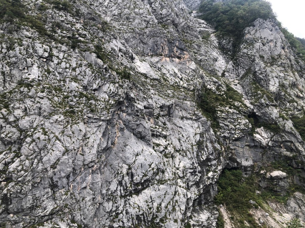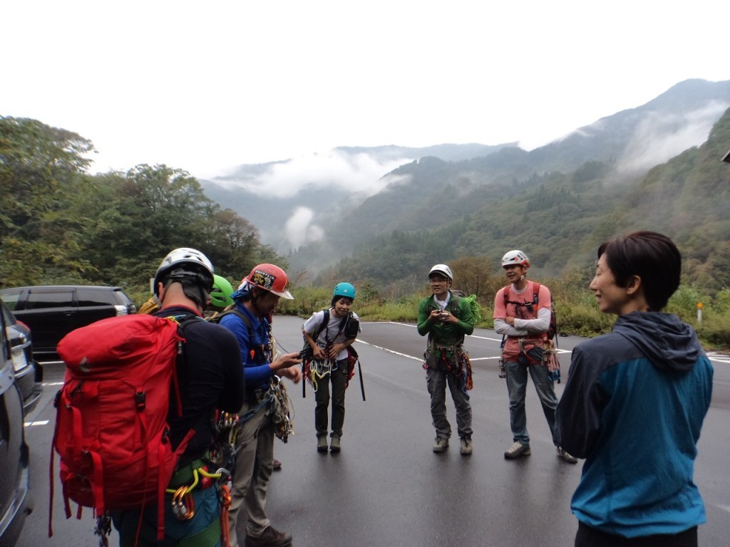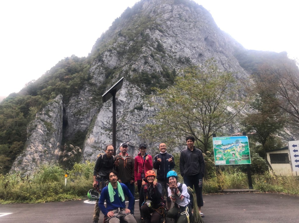 (山宮)今年も会山行で明星山P6南壁へアルパインクライミングに行く計画を立てました。フリースピリッツと左岩稜の2ルートを登ることになりフリースピリッツは吉川さんと松本さんの2人が希望したので私がリーダーになり計画書を作成しました。私と左岩稜組の石附さん、竹内さんの3人は金曜の夜に駐車場に着いて前夜泊をしましたが、悪い予報をしていた天気予報通り朝2時か2時30分頃に一雨きました。30分ぐらいで止んだと思いますが、がっつり降ったので『今日は大丈夫かな?』と心配しましたがまたすぐ寝ました。起床して外に出ると駐車場の舗装が濡れていて敗退の予感・・・とりあえず明るくなってから対岸から岩の様子を見て判断しようと出発時間を遅らせました。明るくなり岩を見ると濡れているところもありましたが、だいぶ乾いてきていたので登攀中に上部は乾くとだろうし下部は若干濡れてても仕方ないと予定より1時間30分遅れて駐車場を出発しました。(松本さんは濡れて岩は嫌だと言って待機&撮影班となりました。)取付で吉川さんに『順番どうしますか?』と相談すると先に行ってくださいとのことだったので私のリードで登攀開始しました。(昨年個人山行で登った時は偶数Pをリードしたので今回奇数Pをリードしたことで全Pリードできて良かったです。)序盤は濡れた石灰岩でフラットソールが滑りました。1~2Pは全濡れ状態。3~4Pは濡れてないところも若干有り。昨年同様5P目からは岩が乾いていました。(ただし7Pのカンテ側に回り込むところはピンポイントに濡れていて足を置いたら滑って思わずヌンチャク掴みました。A0したのはここだけでした・・・。)ルーファイですが昨年個人山行で登っていたのでミス無く登れました。この日のフリースピリッツは私たちだけで静かなクライミングを楽しめました。