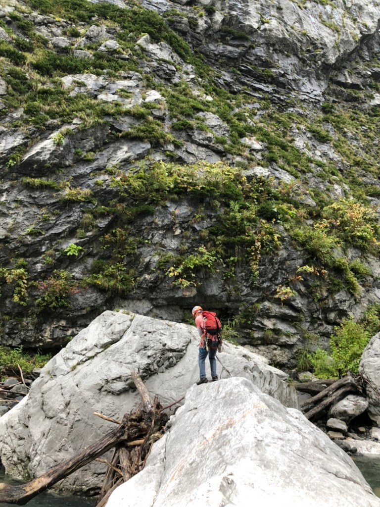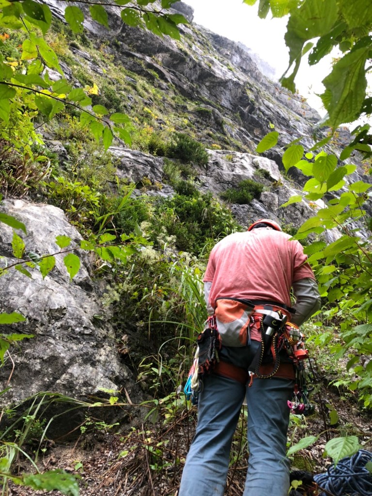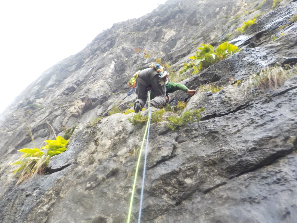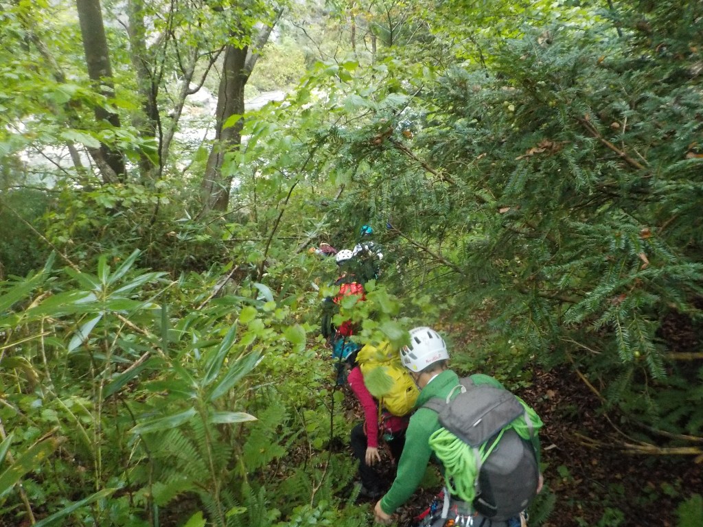 ・岩は濡れていました。落ちないよう濡れた灌木を掴みながらの草クライミング。
