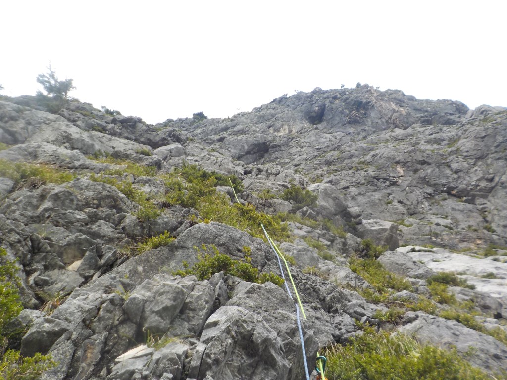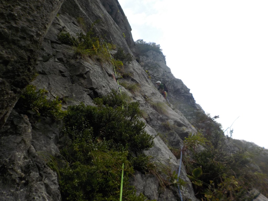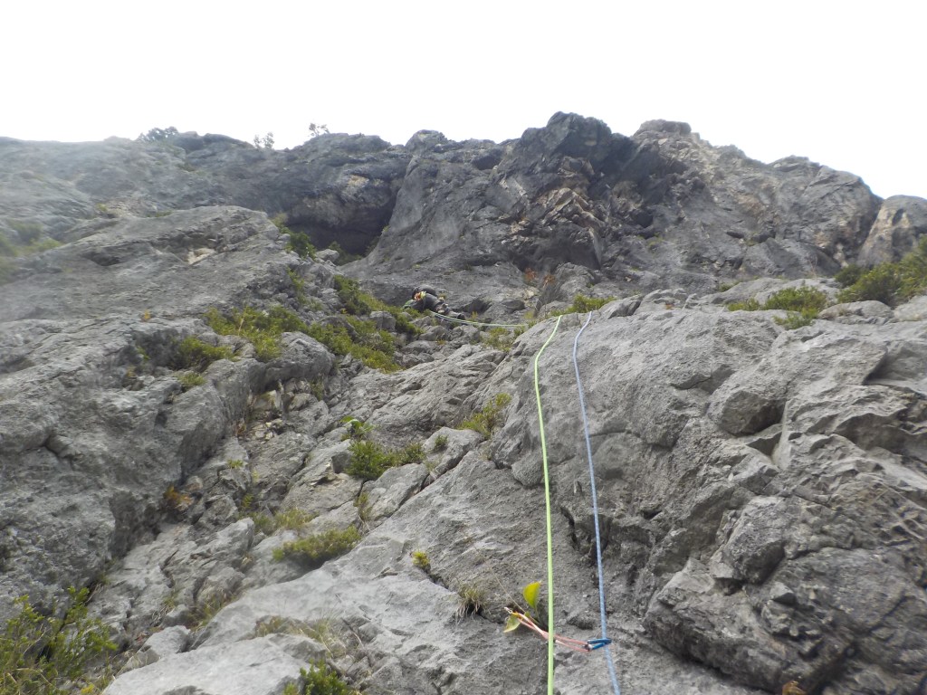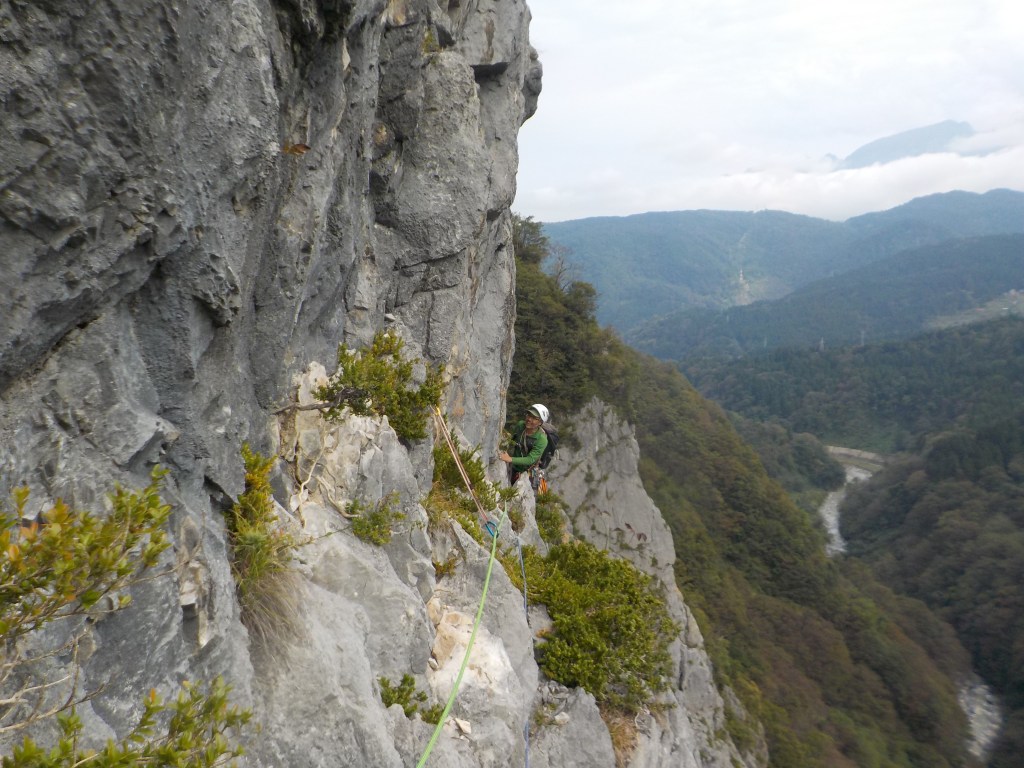 ・凹角を抜けると景色が開けます。右に見えるスラブにはたくさん残置中間支点が見えますがそちらへは迷い込まず階段状フェイスを灌木で支点を取りながら上へ登るとハング帯下に終了点が見えてきます。