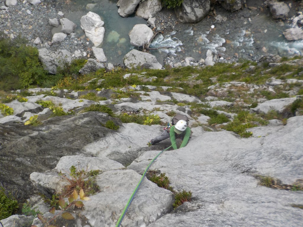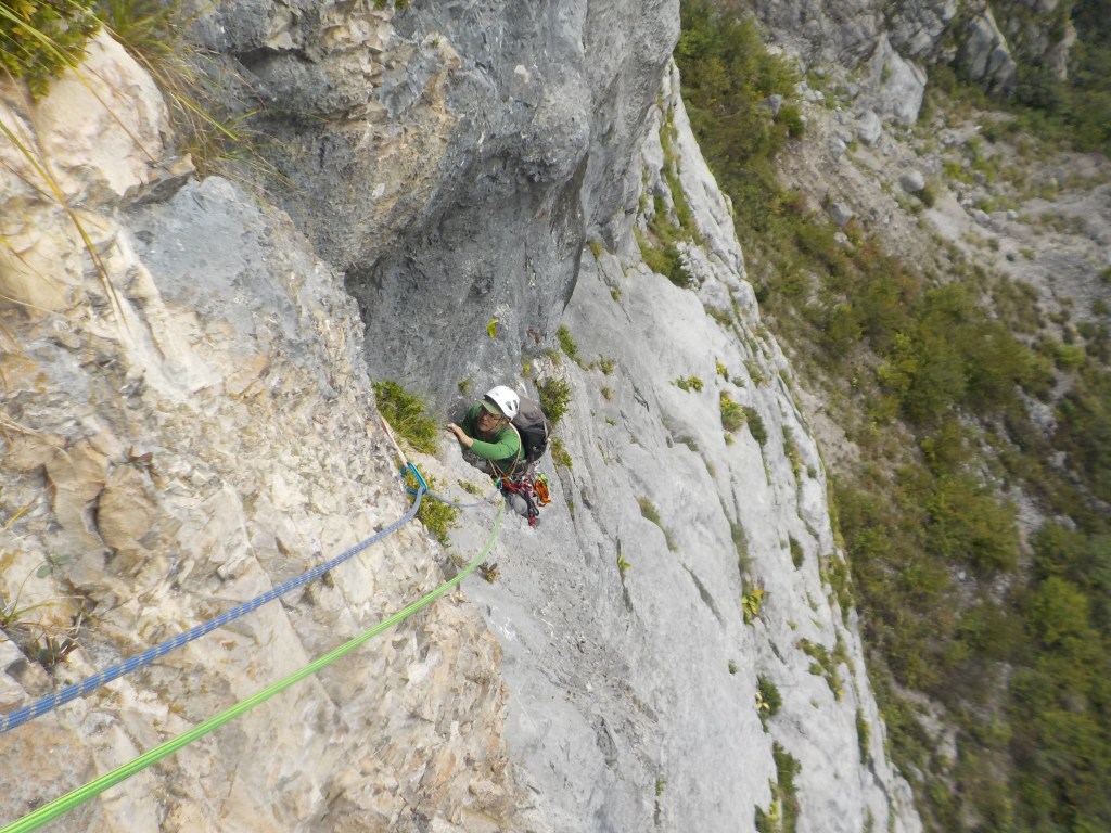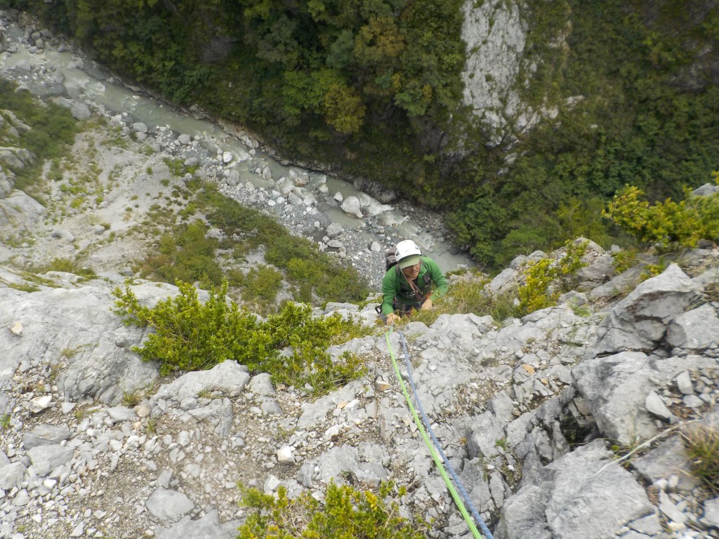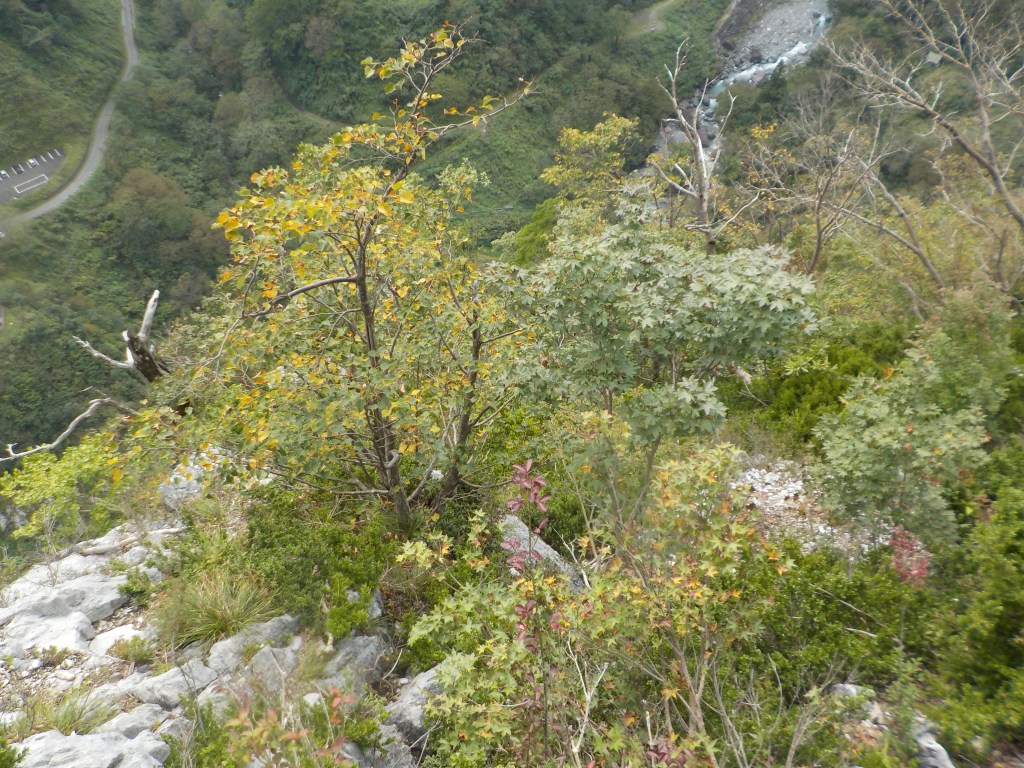 ・凹角を抜けると景色が開けます。右に見えるスラブにはたくさん残置中間支点が見えますがそちらへは迷い込まず階段状フェイスを灌木で支点を取りながら上へ登るとハング帯下に終了点が見えてきます。