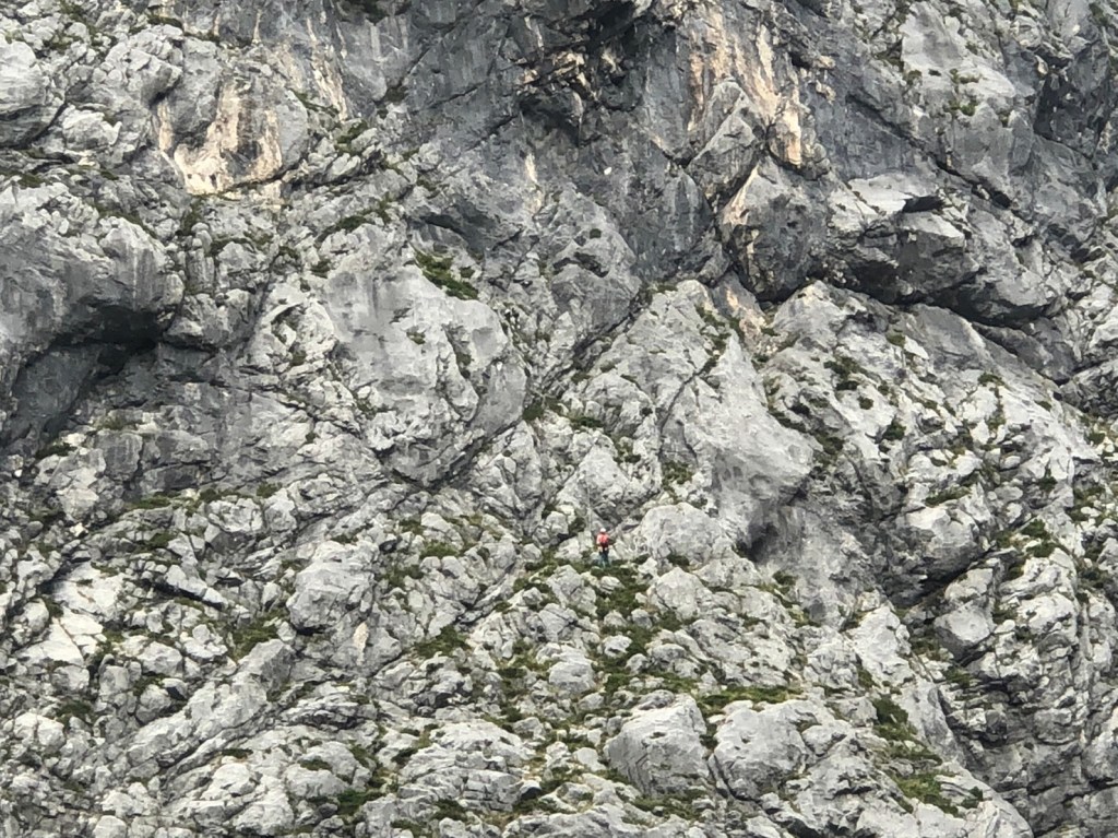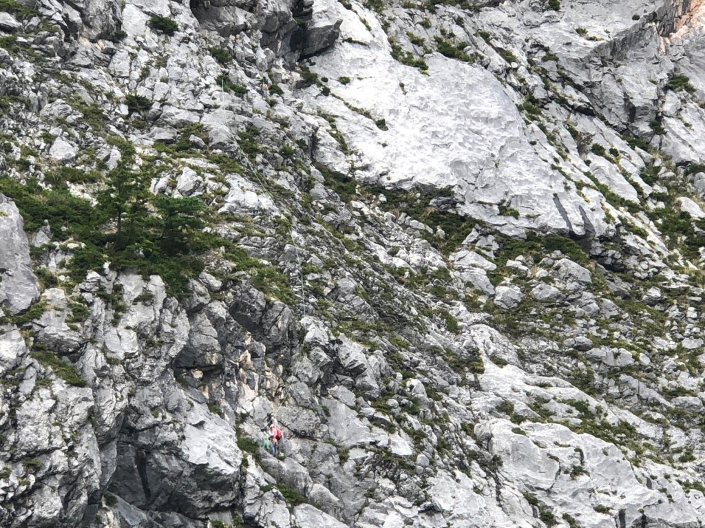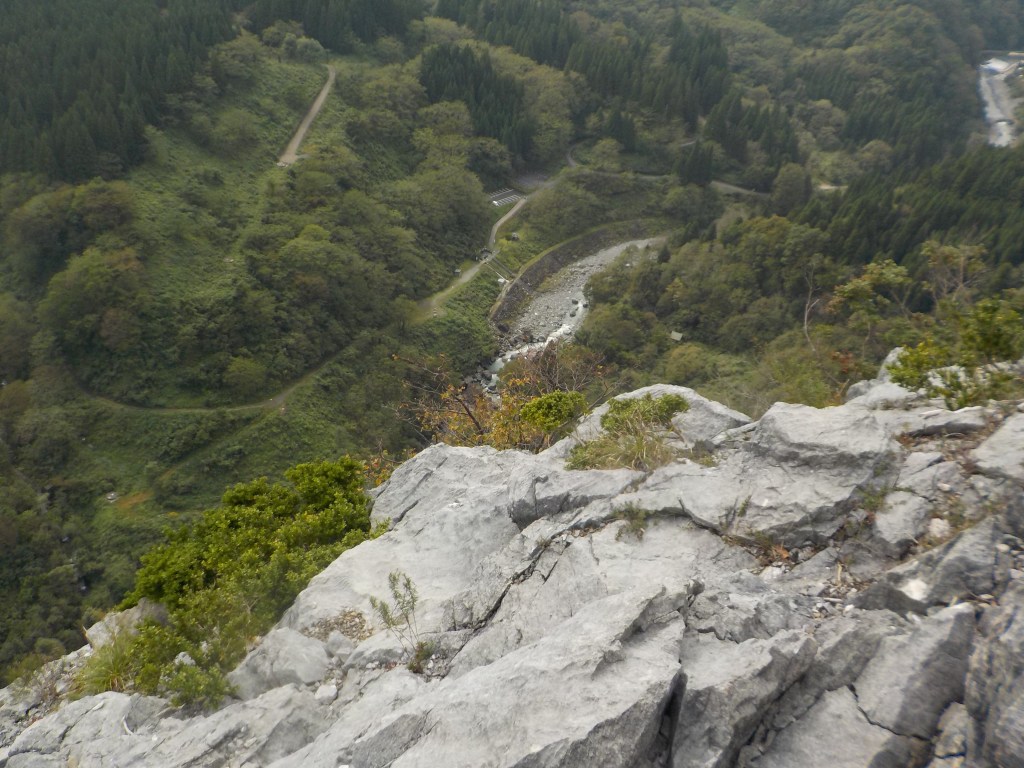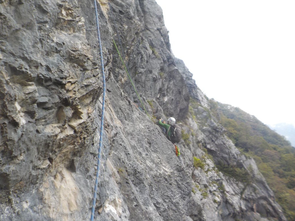 (吉川)夜の雨の影響で貸切でしたが下部は濡れていて滑りました。3ピッチ目くらいからはそこそこ乾いていてフリクションも効きました。複数のルートが交差するので非常にわかりにくかったですが、山宮さんにトポを見ながら教えてもらって安全に登ることができました。残地ハーケンは厳しい箇所以外は少なく、細い灌木などを利用しました。今にも落ちそうな石、岩が多数あり細心の注意を要しました。
