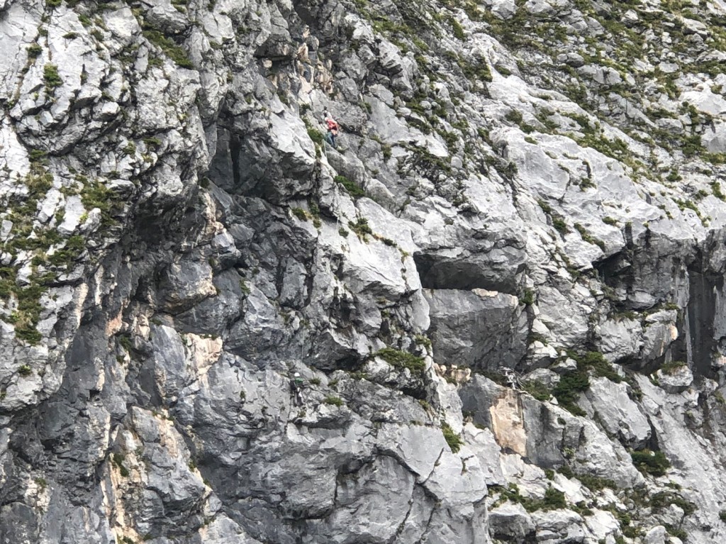 7P目終了点でビレイする山宮と7P目登攀中の吉川さん(アップで)