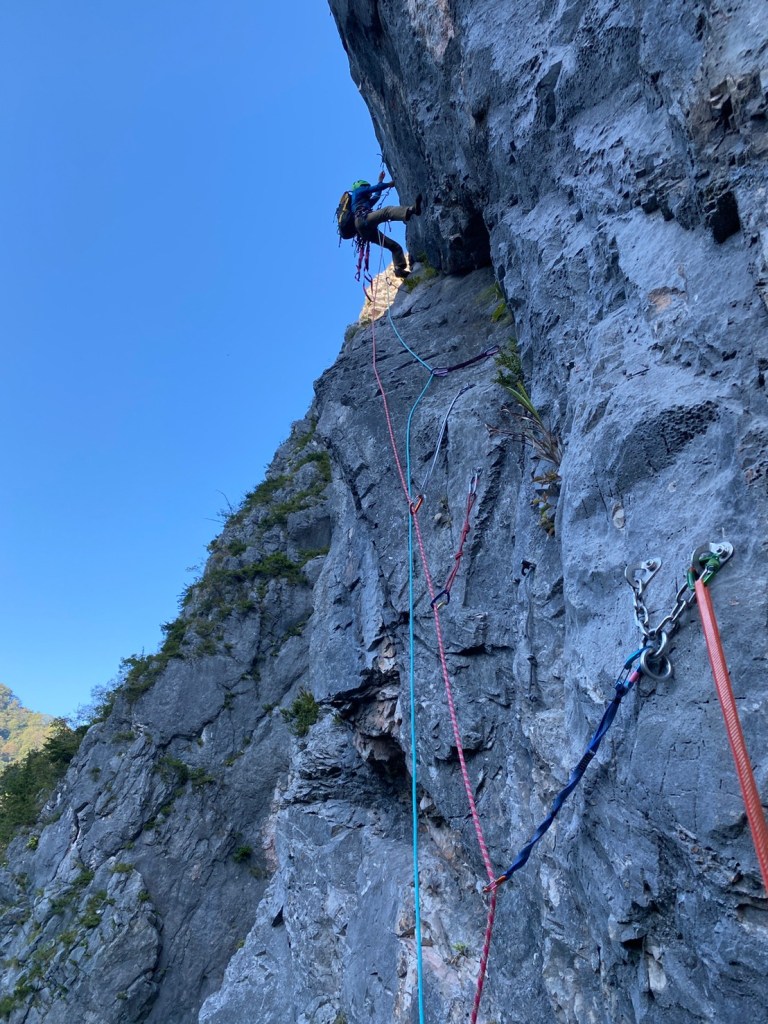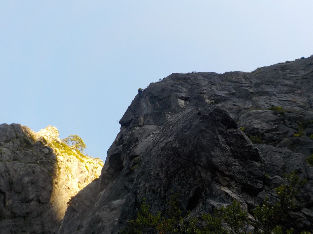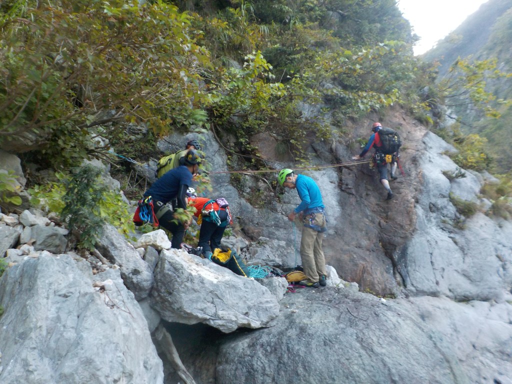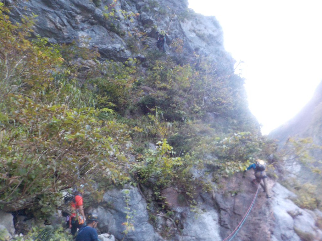 (石附)アブミのピッチは入門メンバーはそこそこの速さで登れたと思います。個人的な反省点として、ロープの束をひっくり返して相方のセルフに乗せると絡まる原因になり、余計な時間を使う事になるので、横着せずいちからたぐり直すべきと分かりました。なお、下山の下降路はより滑りやすく荒れてきているので気を付けて下さい。
