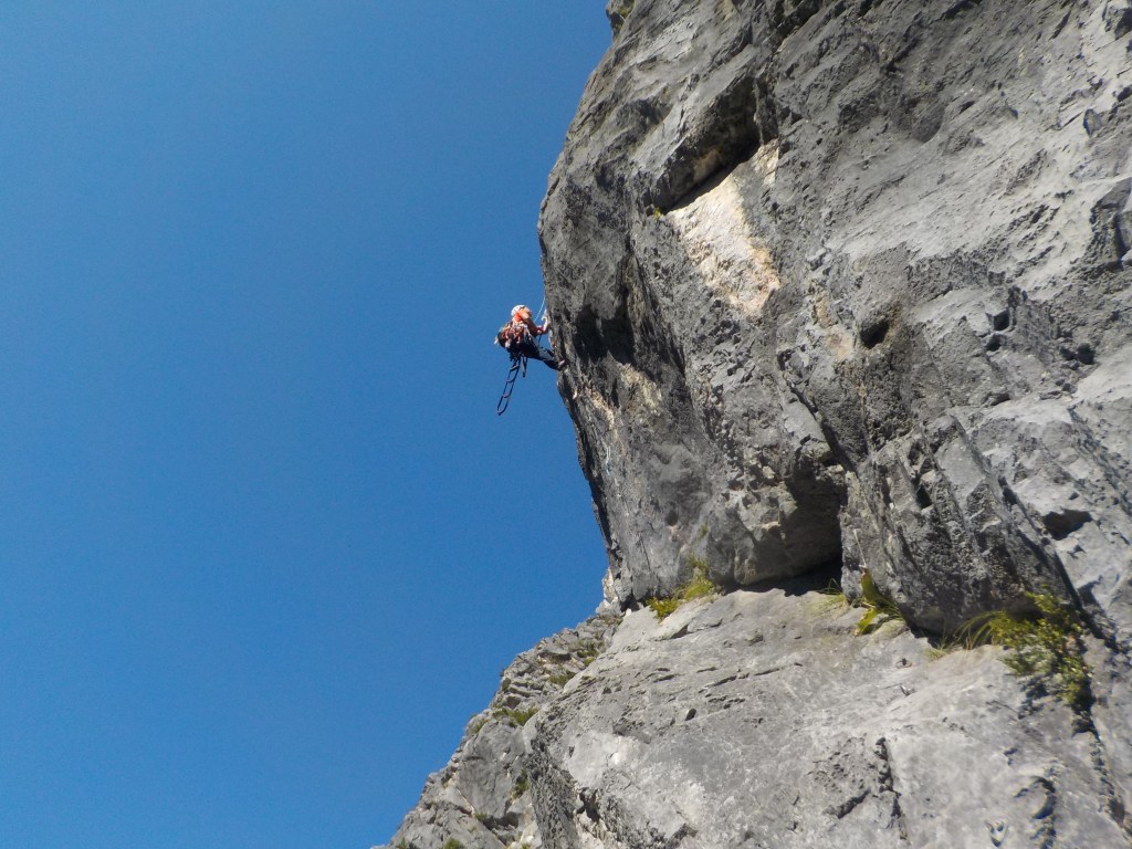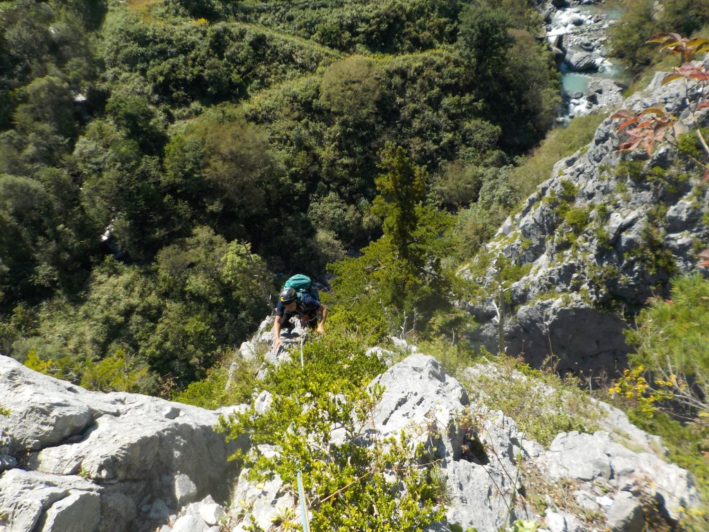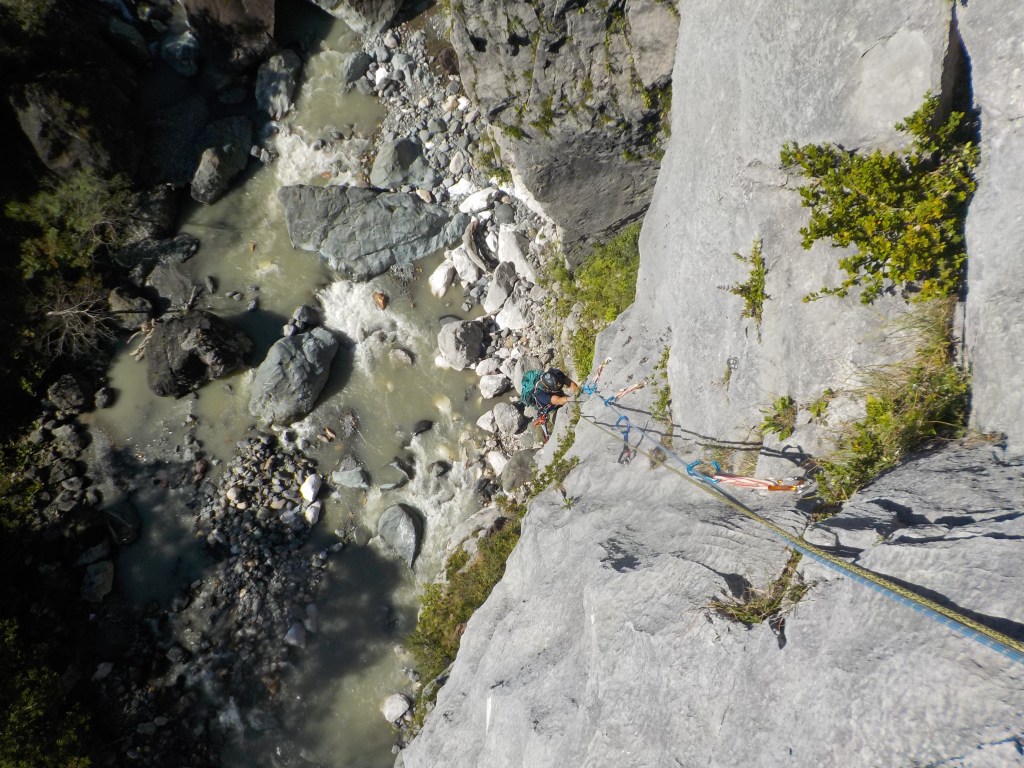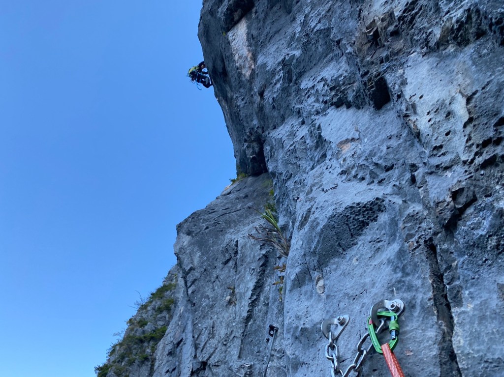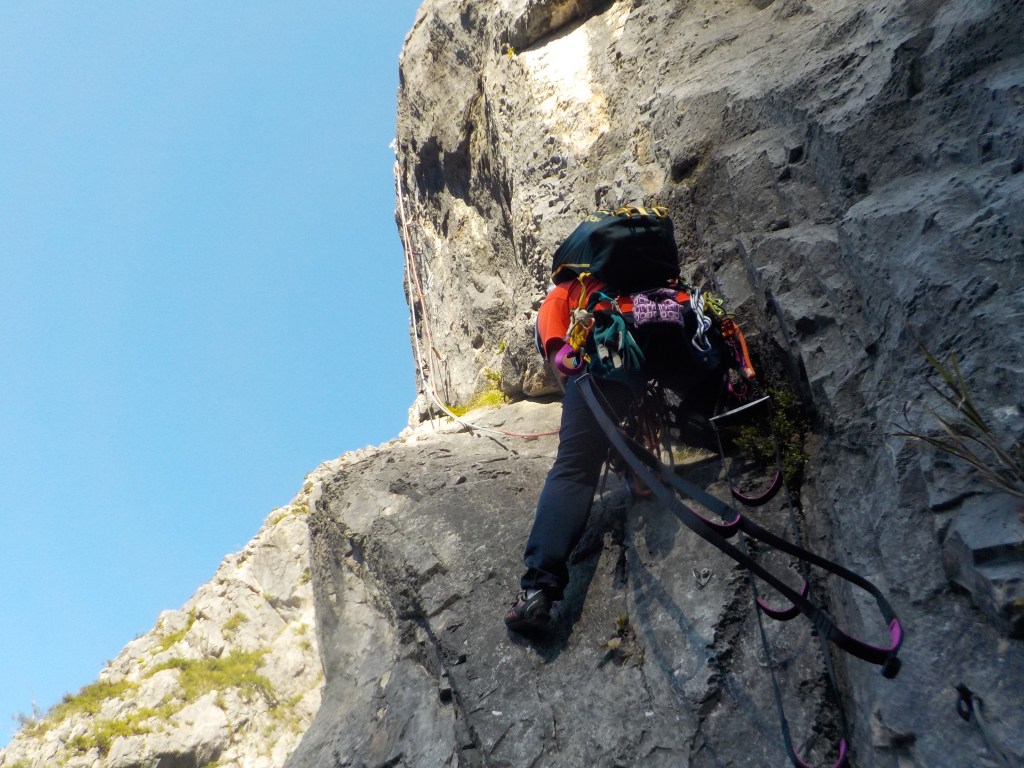 (石附)アブミのピッチは入門メンバーはそこそこの速さで登れたと思います。個人的な反省点として、ロープの束をひっくり返して相方のセルフに乗せると絡まる原因になり、余計な時間を使う事になるので、横着せずいちからたぐり直すべきと分かりました。なお、下山の下降路はより滑りやすく荒れてきているので気を付けて下さい。