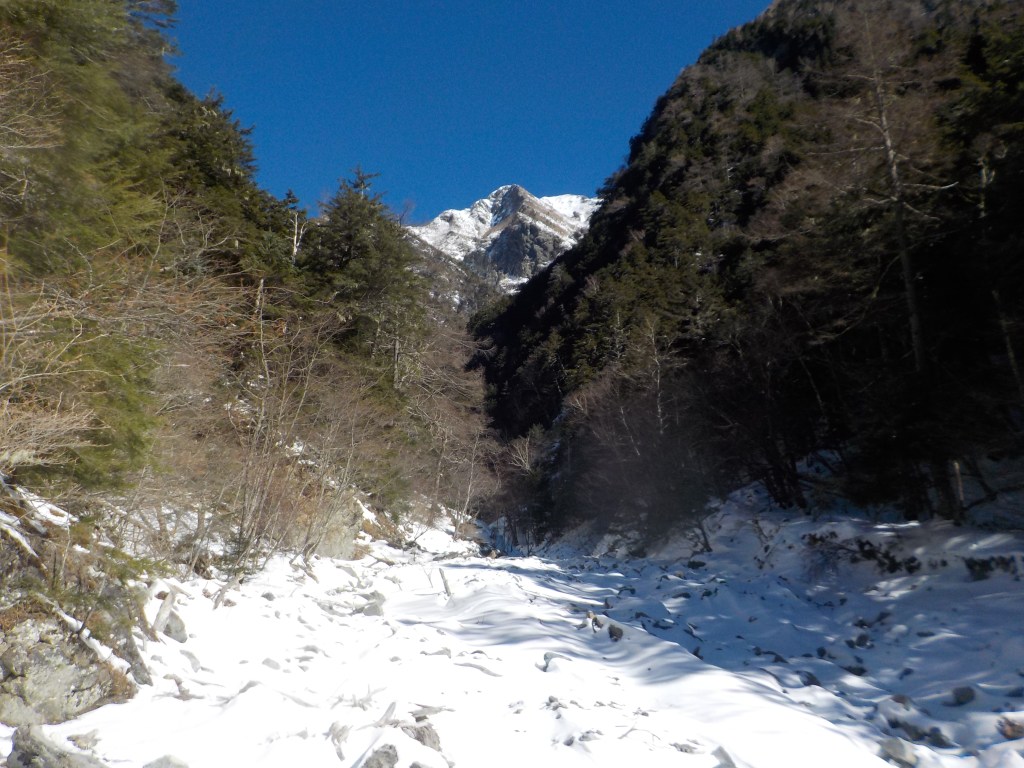 ・岳沢越への沢筋の登りは踏み跡が判然とせずに初見では時間がかかると思います。私たちは今回沢内を登らずに前回敗退時に使った下降路を登ろうと最初から左側の斜面というか尾根筋を登っていきましたが、途中に岩が出てきて迂回しなければならないところもあり時間がかかりました。(前回敗退時に使った下降路は1年前の記憶なので定かではありませんでした。)沢内の氷結した滝を過ぎると右岸の尾根にはフィックスされたトラロープが出てくるので氷結した滝に突き当たるまでは沢内を詰めて突き当たったら右岸の尾根に上がりトラロープを辿って登るのが一番早くて楽に登ることができると思います。トラロープは途中の開けたところで一旦途切れますが沢を右へ横切らずにそのまま上へ登っていけばまたトラロープが現れると思います。(私たちはトラロープが途切れたところから沢を右へ横切りましたが横切り終えたあとに右岸の上部にトラロープがあるのを目視しましたが、戻るのが面倒だったのでそのまま倒木のうるさい樹林帯を登って時間がかかりました。)