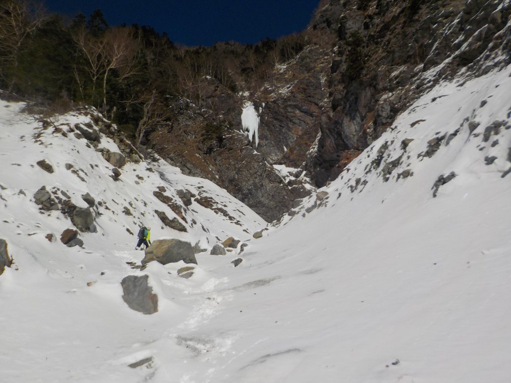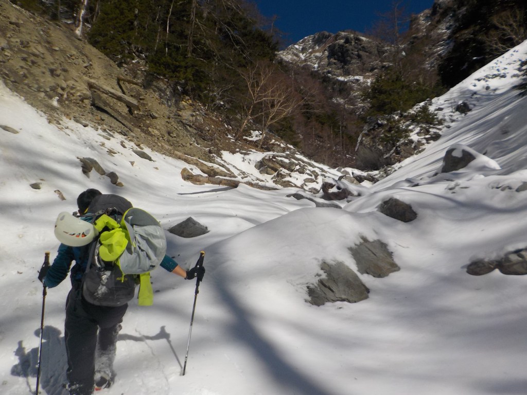 ・岳沢出合からノートレースの沢内を2人でラッセル。途中で後続パーティー(ヒマラヤキャンプに参加している3人組)が追いついてくれてラッセルを交代できて助かりました。F1下までは2時間かかりました。