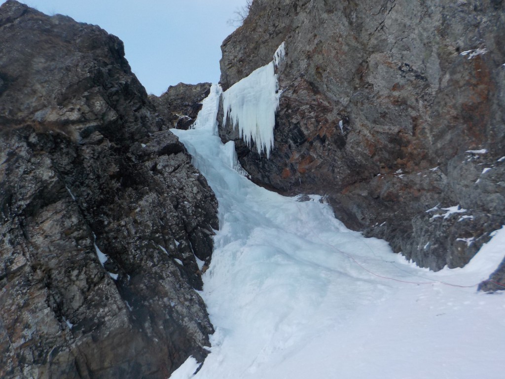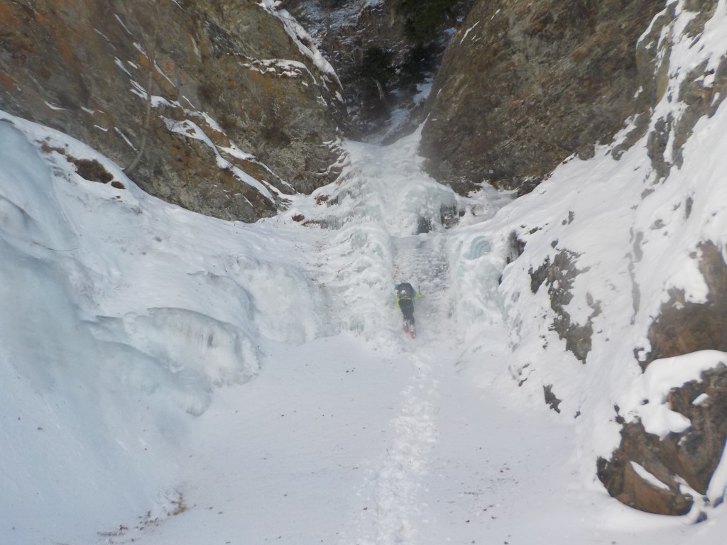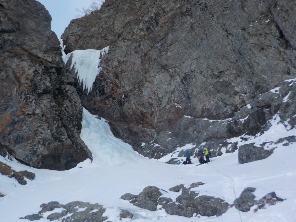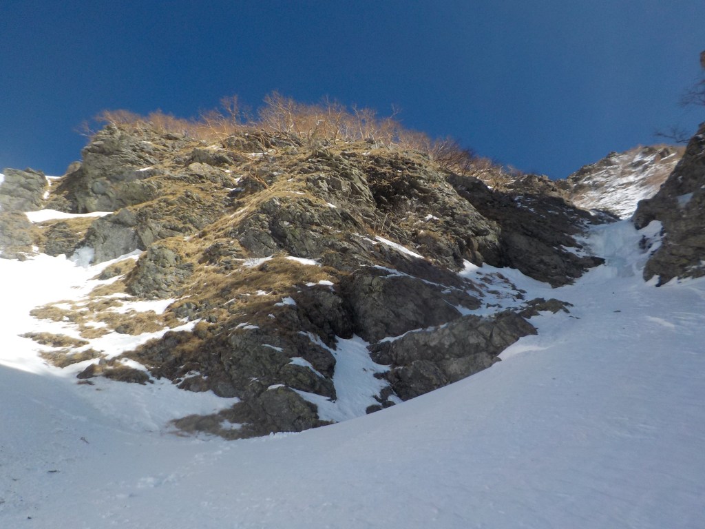 F5:20m だいぶ埋まっていたナメ滝みたいのがあったがそれがF5だったらしい。(右側の雪面を登っていったので結果的に巻く形となった。)