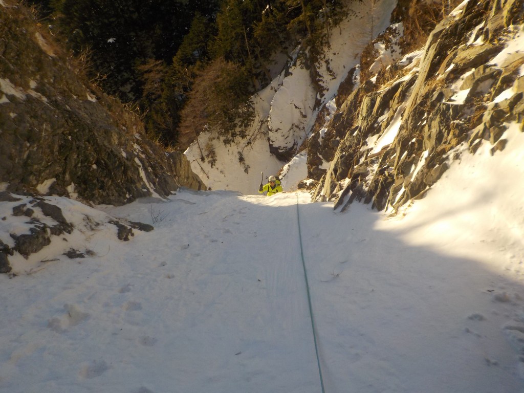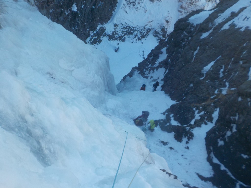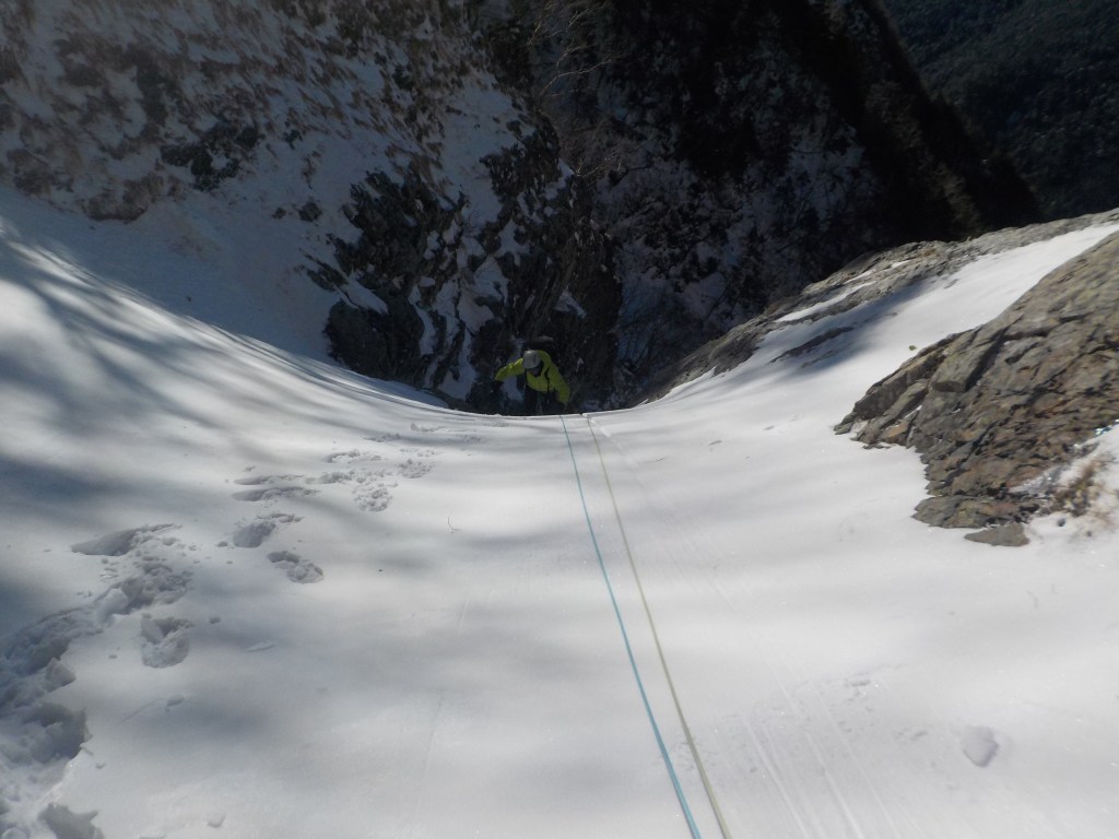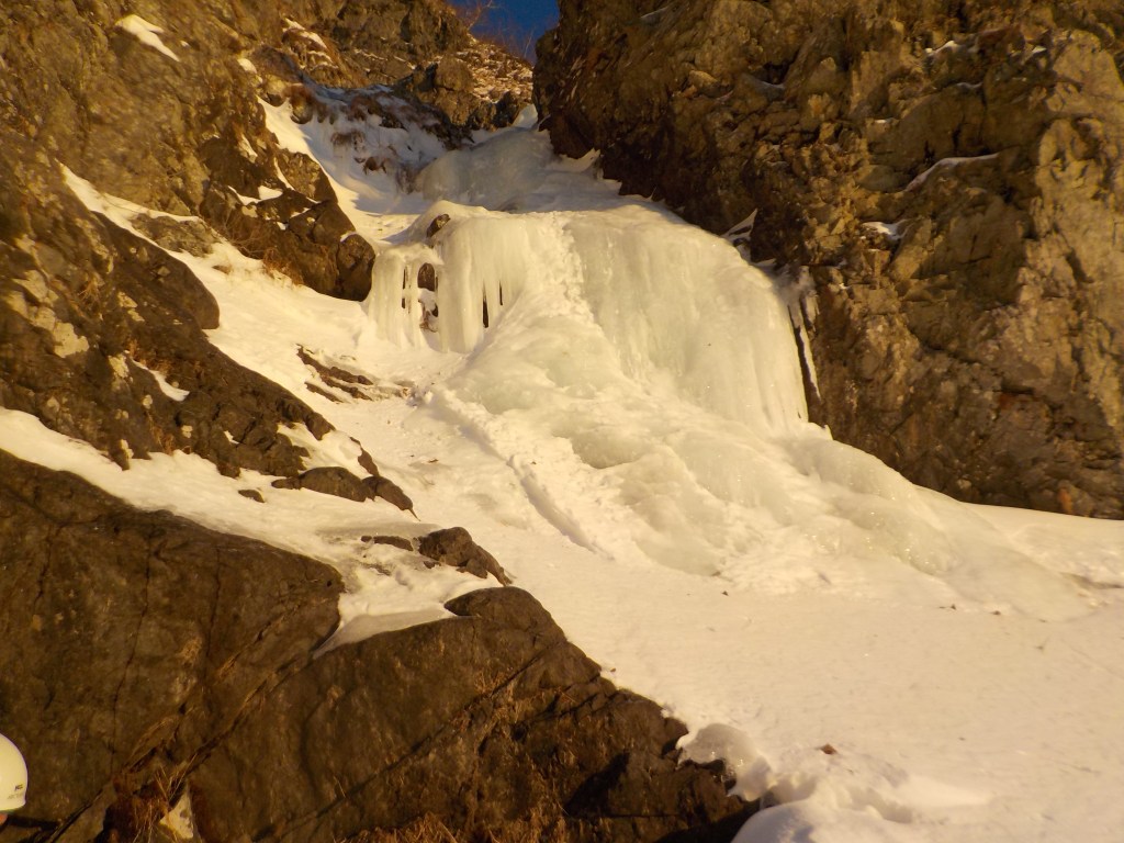 F5:20m だいぶ埋まっていたナメ滝みたいのがあったがそれがF5だったらしい。(右側の雪面を登っていったので結果的に巻く形となった。)