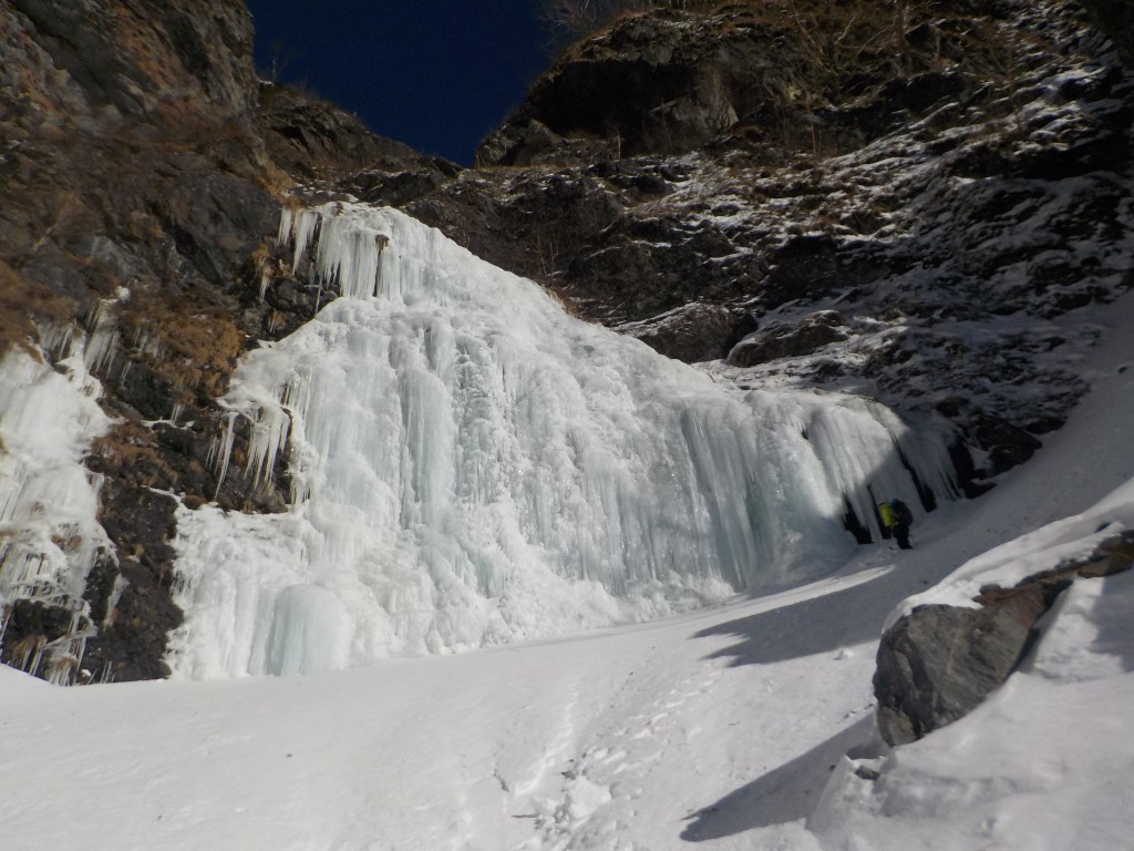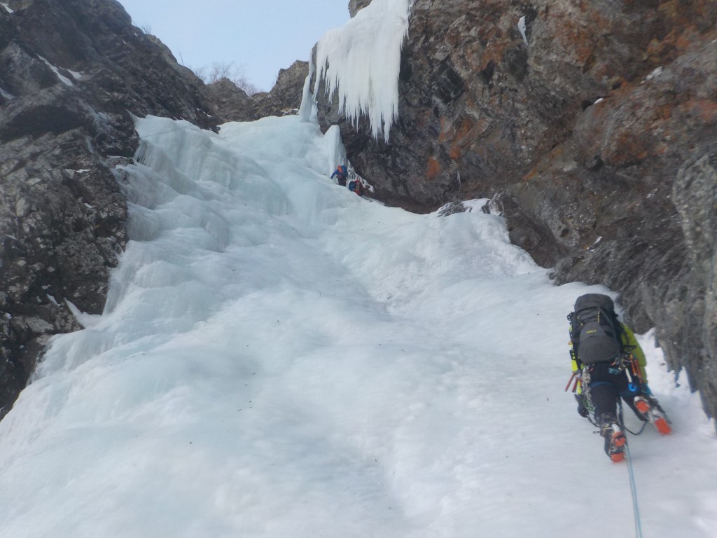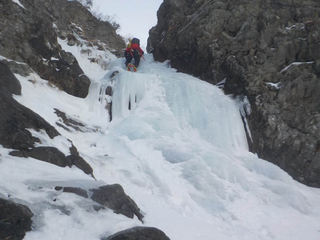 F8(ソーメン流しの滝):110m 1P目をTさん、2P目をヤマパンがリードで登る。(1P目は右端を登っていき上のテラス状まで。終了点はアイススクリュー2本で構築。水がジャージャーしてるところもありました。2P目は空いている左のラインから登りましたが左端の氷は薄く脆い感じだったので中央よりを登る羽目になりました。終了点は右岸の灌木で構築。)
