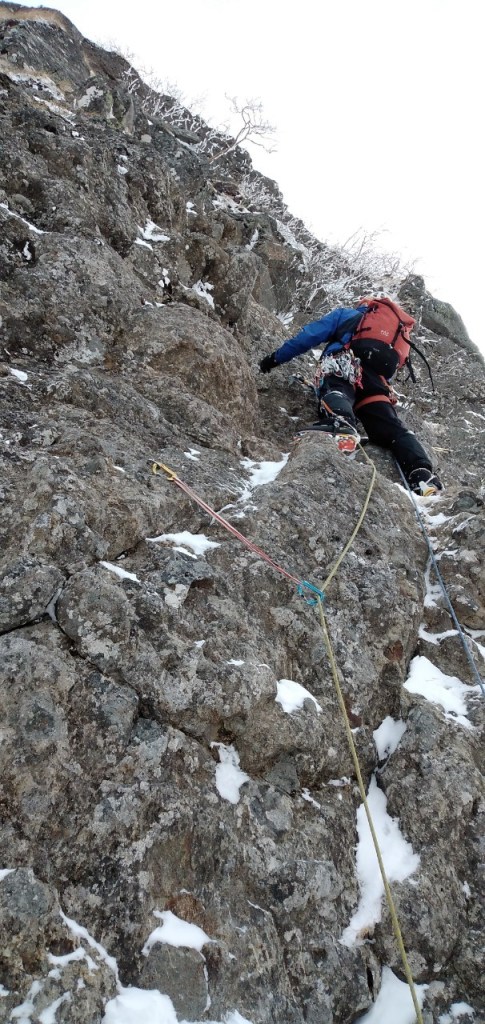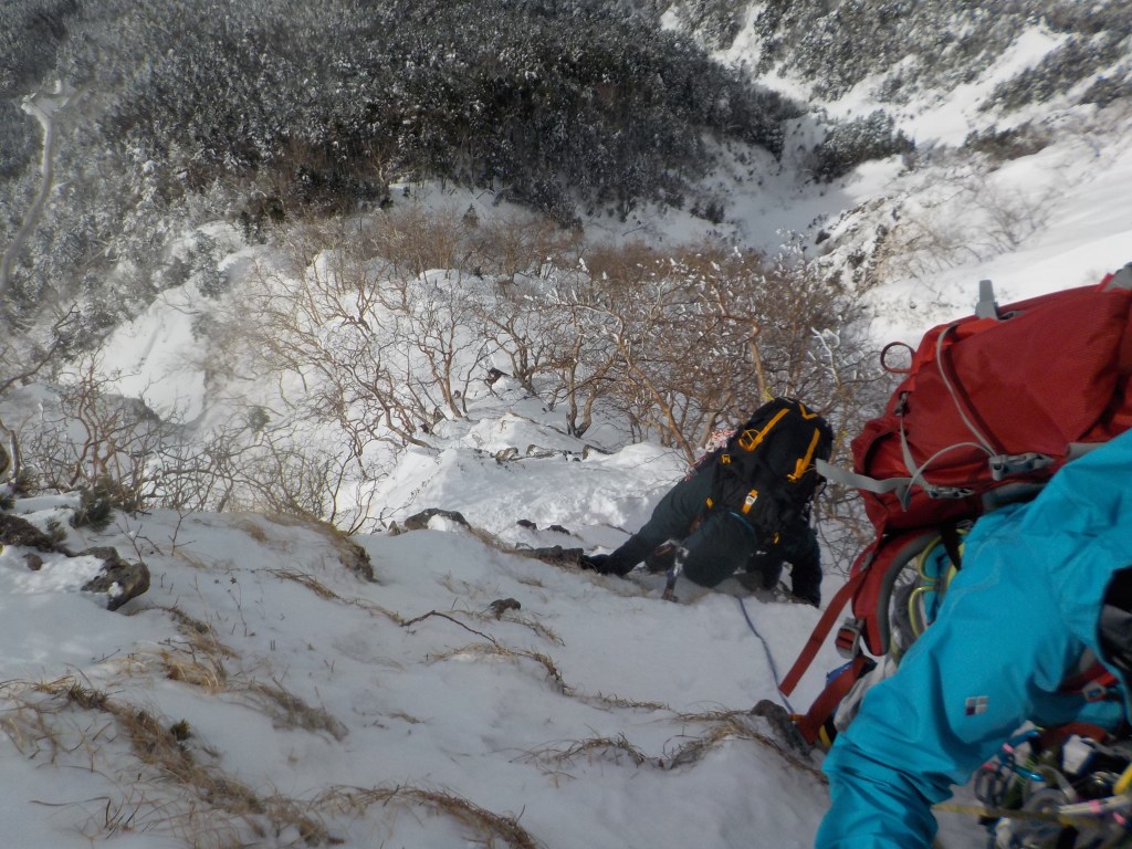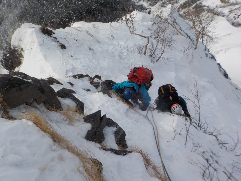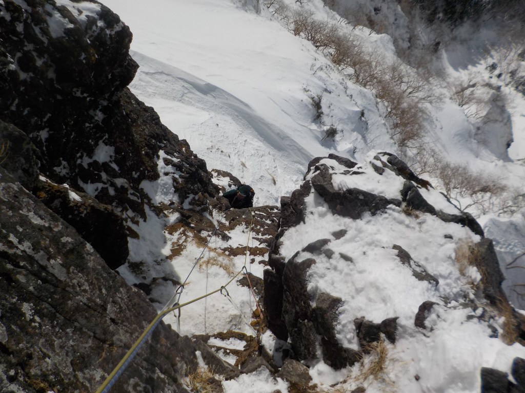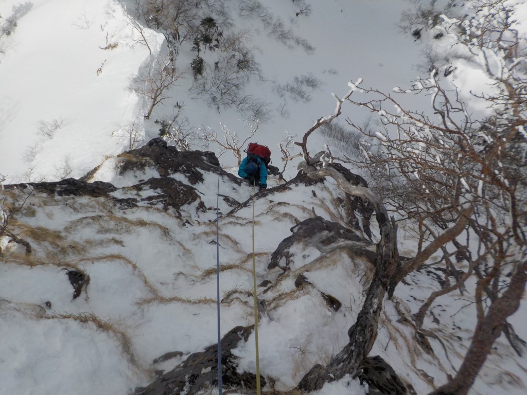・スタートは右に下がって凹角に入りこれを左上するようですが、右下への下降は急斜面にやわらかい雪が付いて悪かったので壁の正面から取付きました。その後凹角内を登ろうと壁を右へと移動しましたが凹角内は雪が付いて登りにくそうだったのでそのまま凹状左の壁の簡単そうなところを適当に登りました。(阿部さんと長谷川さんは出だしの登りで苦戦してました。)
