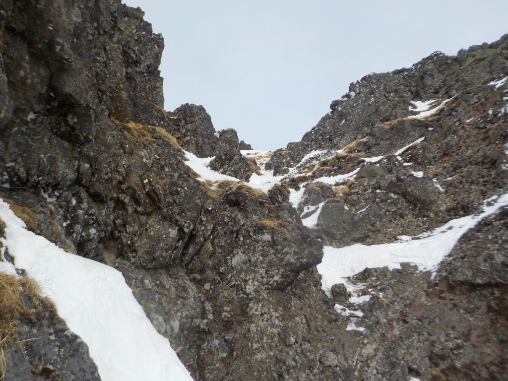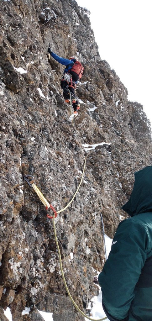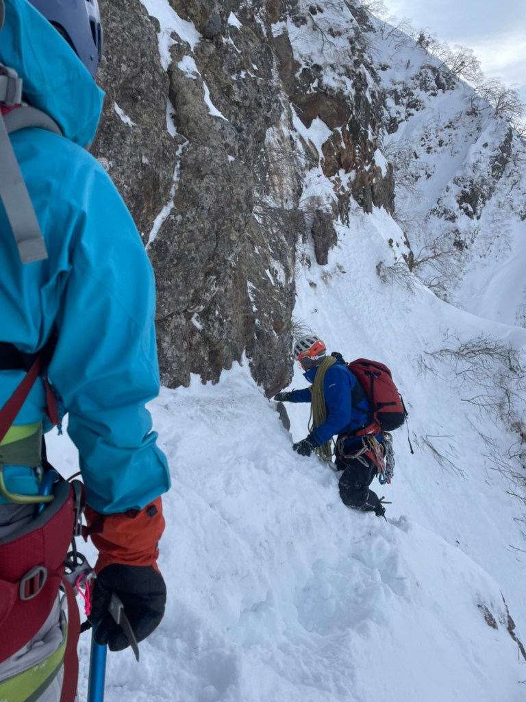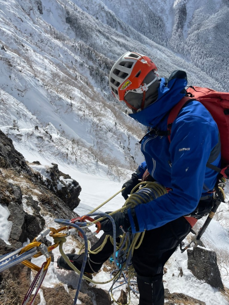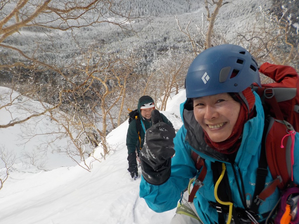 ・スタートは右に下がって凹角に入りこれを左上するようですが、右下への下降は急斜面にやわらかい雪が付いて悪かったので壁の正面から取付きました。その後凹角内を登ろうと壁を右へと移動しましたが凹角内は雪が付いて登りにくそうだったのでそのまま凹状左の壁の簡単そうなところを適当に登りました。(阿部さんと長谷川さんは出だしの登りで苦戦してました。)