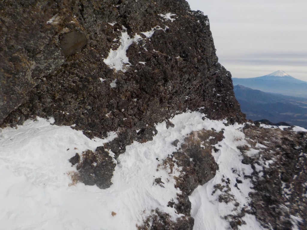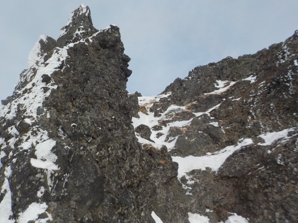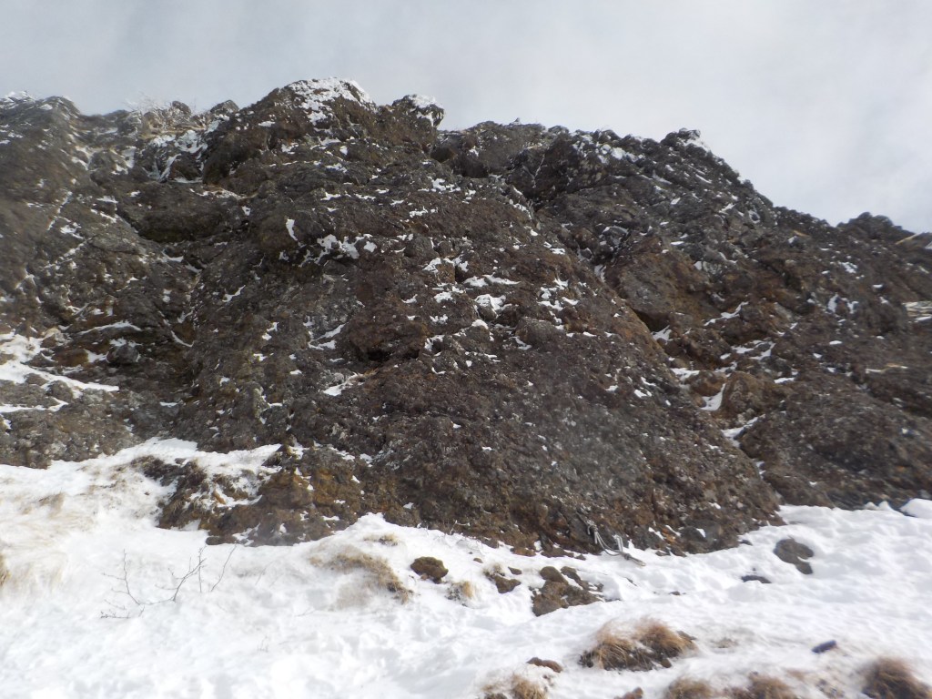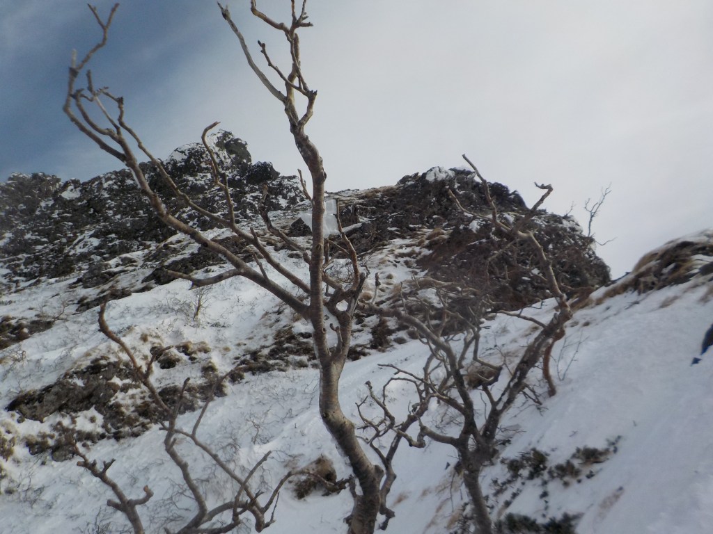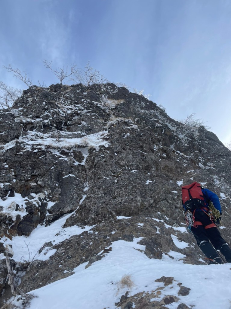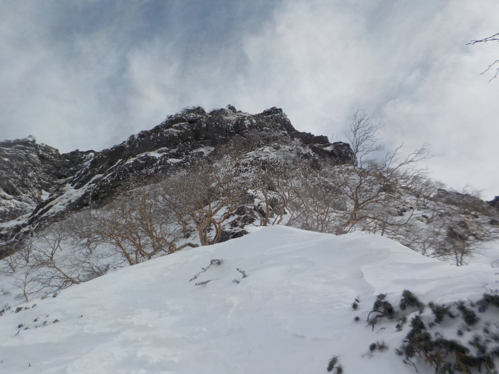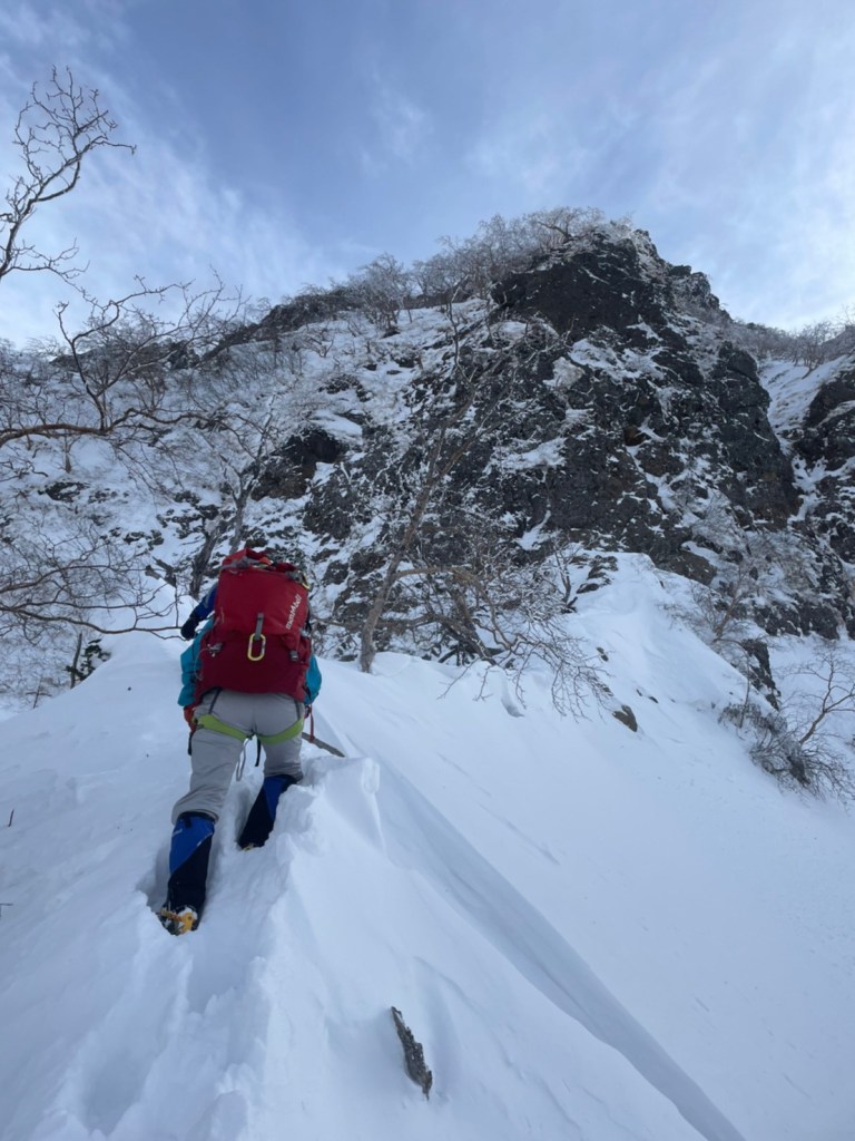 ・樹林帯を抜けるとラッセルは終わり正面に下部岩壁が見えるのでそこで休憩&ロープをザックから出しておきリッジを歩いて1P目の取付まで歩きました。