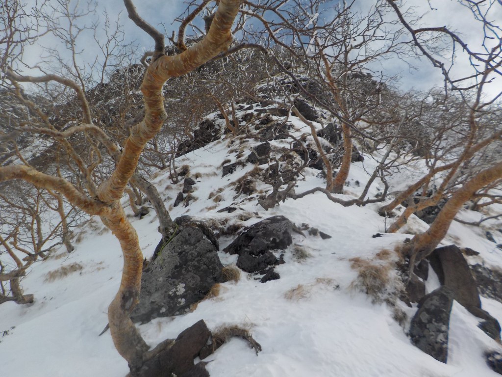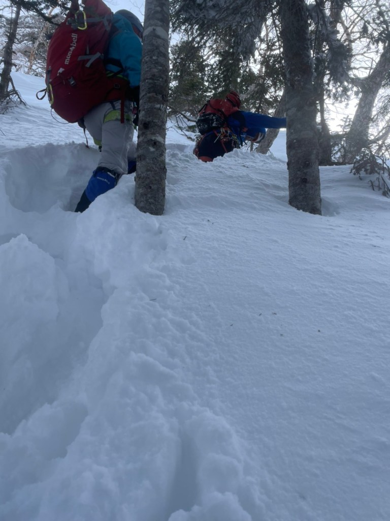 ・中山乗越からは樹林帯を抜けるまでラッセルでした。薄いトレースがあるところは膝ラッセルでしたがトレースが無くなっているところ(吹き溜まって?)は股下から腰上ラッセルでした。