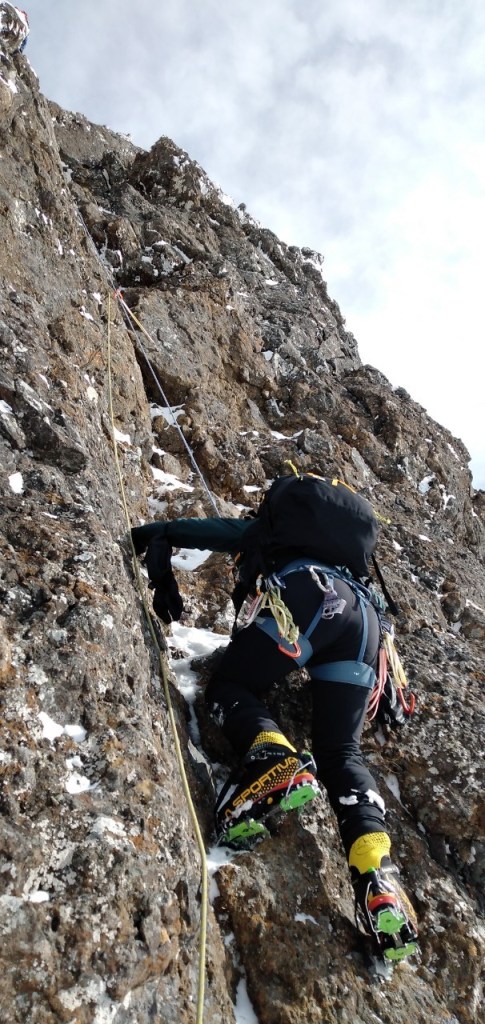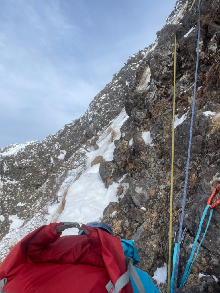 ・コンテで登っていた途中にハンガー1つと残置ハーケン1つの終了点にできるところがあったのでそこが5P目終了点だと思いこみピッチを切りました。フォローの阿部さんと長谷川さんの2人と相談すると疲れたし時間もかかっているのでトポ6P目はフェースを登らず草付を巻きたいと言うのでフェースは登らずに左の草付から回り込みピナクル上を目指しました。が、そこはまだ岩混じりの雪稜の区間で少し登るとハンガー2つの終了点がありました。