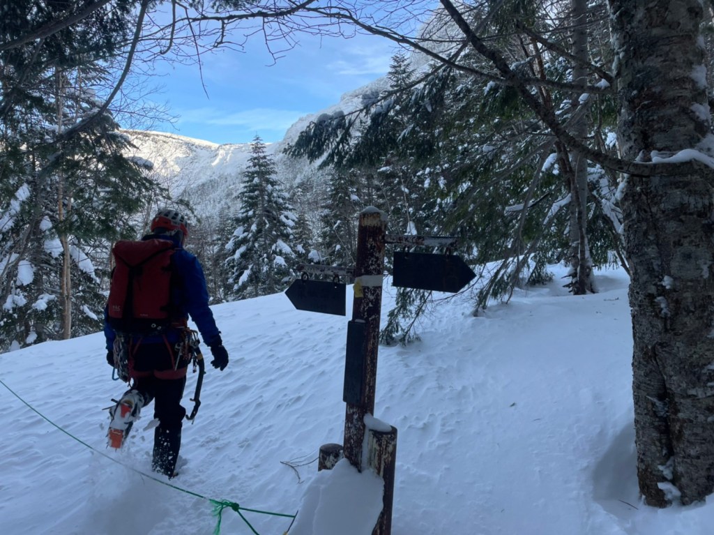 (阿部)中山尾根は赤岳山荘からのスタートとなり中山尾根分岐までの道のりは問題ありませんでした。中山尾根分岐~取付までは積雪により薄くなった踏み後と黄色テープに導かれるラッセルとなりました。ラッセル最後の雪が深いところで私が力尽きてしまい体力不足を痛感いたしました。岩場については、全くお恥ずかしい限りですがほぼ全てのポイントで引っ張り上げてもらいました。全くの力不足でした。アイスキャンディーは団体さんが講習で入っていたため場所が確保できるか不安でしたが1箇所確保していただきました。山宮会長にコツを教えていただきながら実践し、注意点を教えていただき、基礎の根幹を教わることが出来ました。全体を通して技術、体力の向上と同じくらい「気持ち」も大事だと感じました。