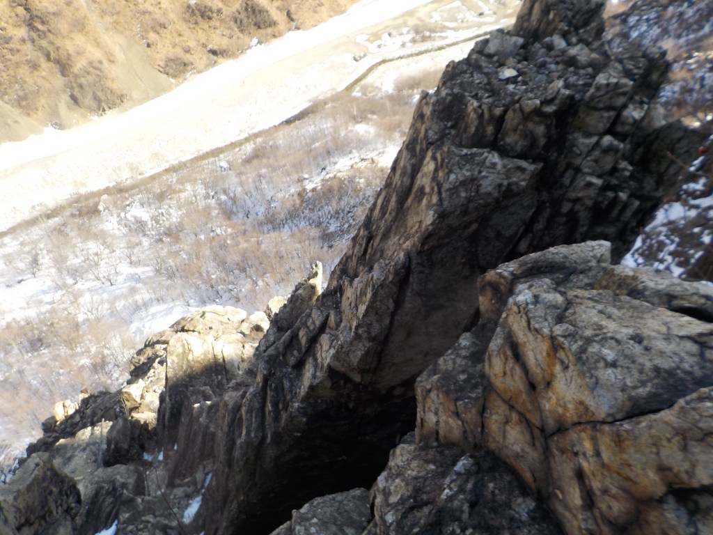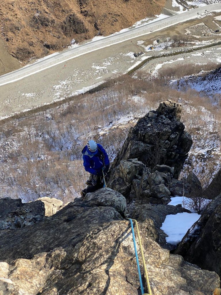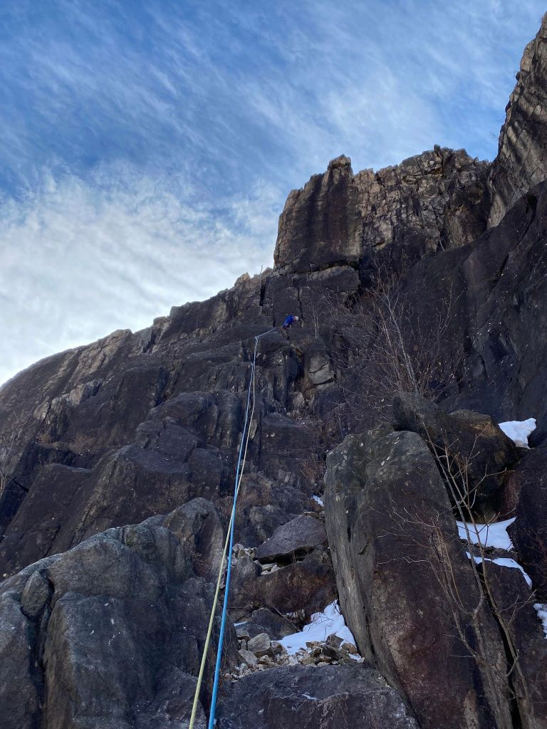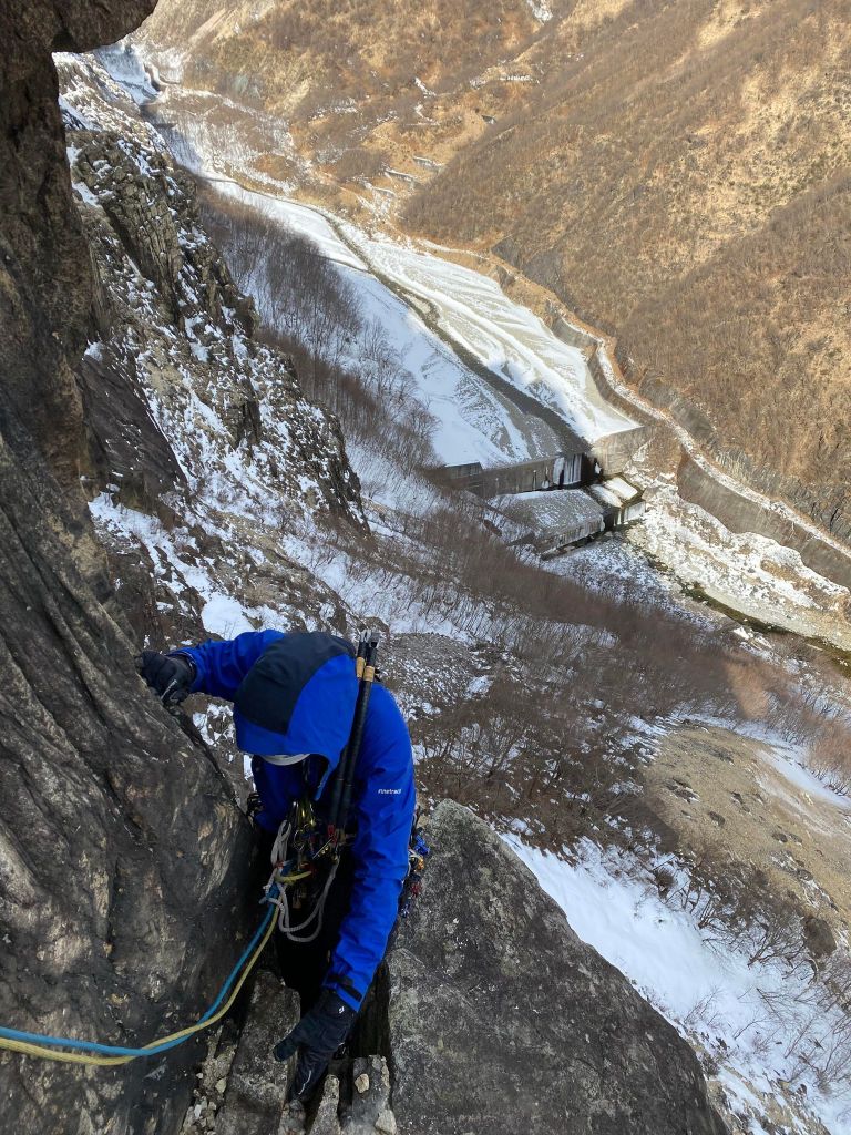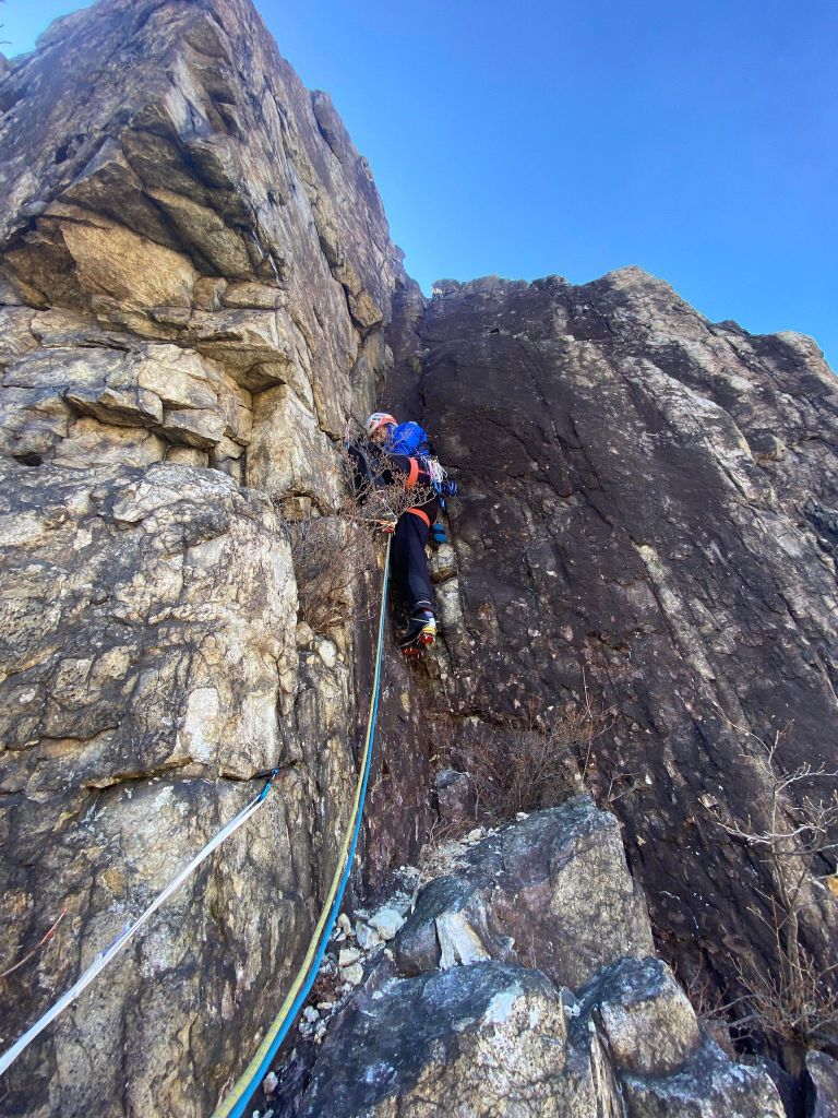 ・2P目(山宮リード):核心となる1段目のチムニーをバックアンドフットで登りザレザレの2段目のチムニーを登って洞門の終了点まで。2段目のチムニーは浮石だらけなので落石させないよう注意しながら登りました。