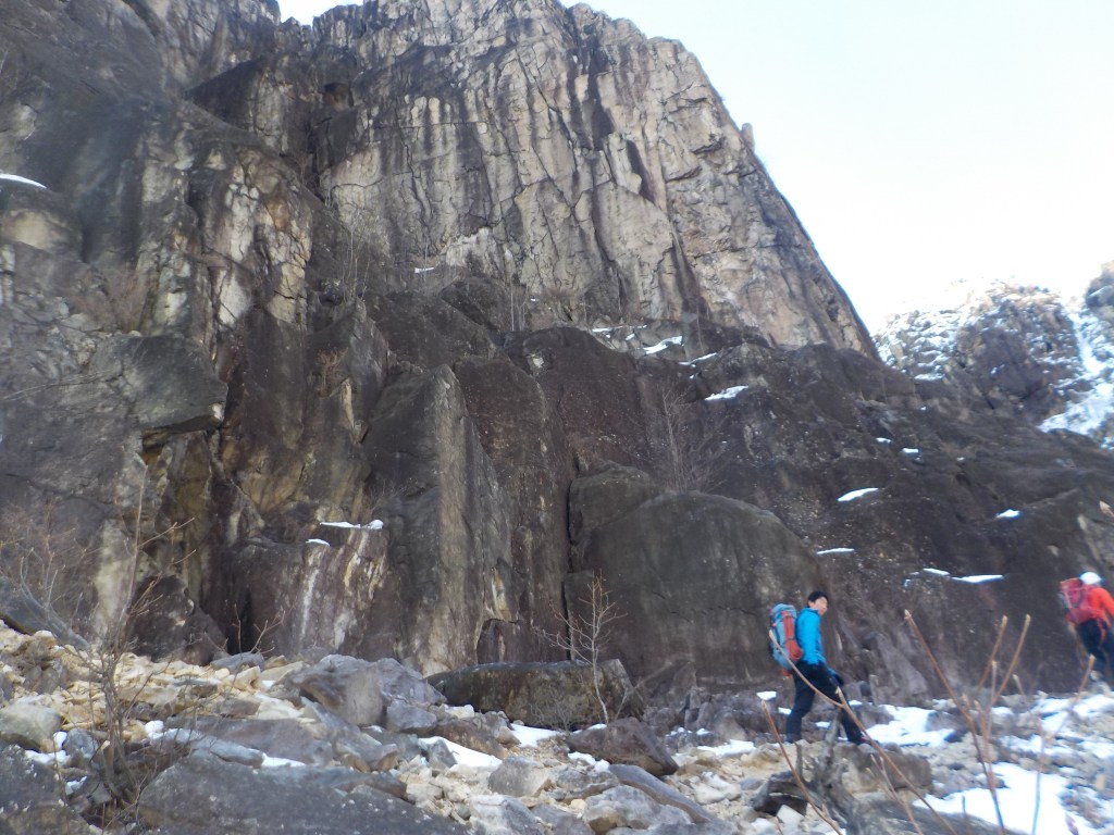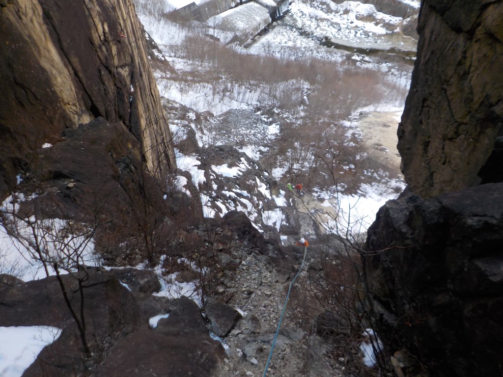 ・下降:洞門から正面ルンゼの終了点まで50mロープ1本で懸垂下降して、そこから50mロープ2本で取付まで懸垂下降しました。