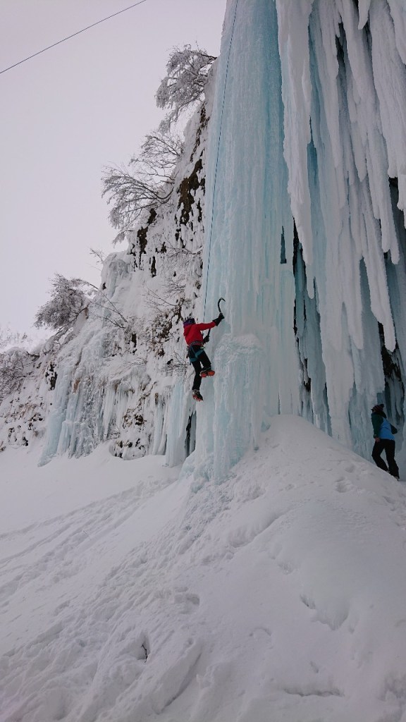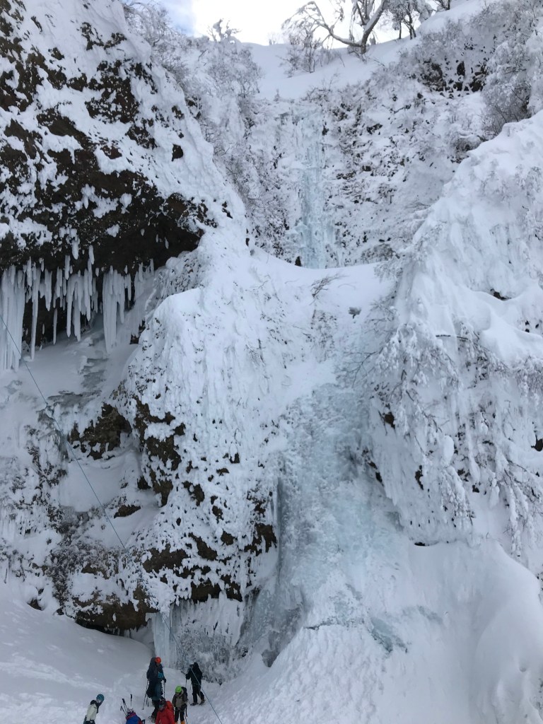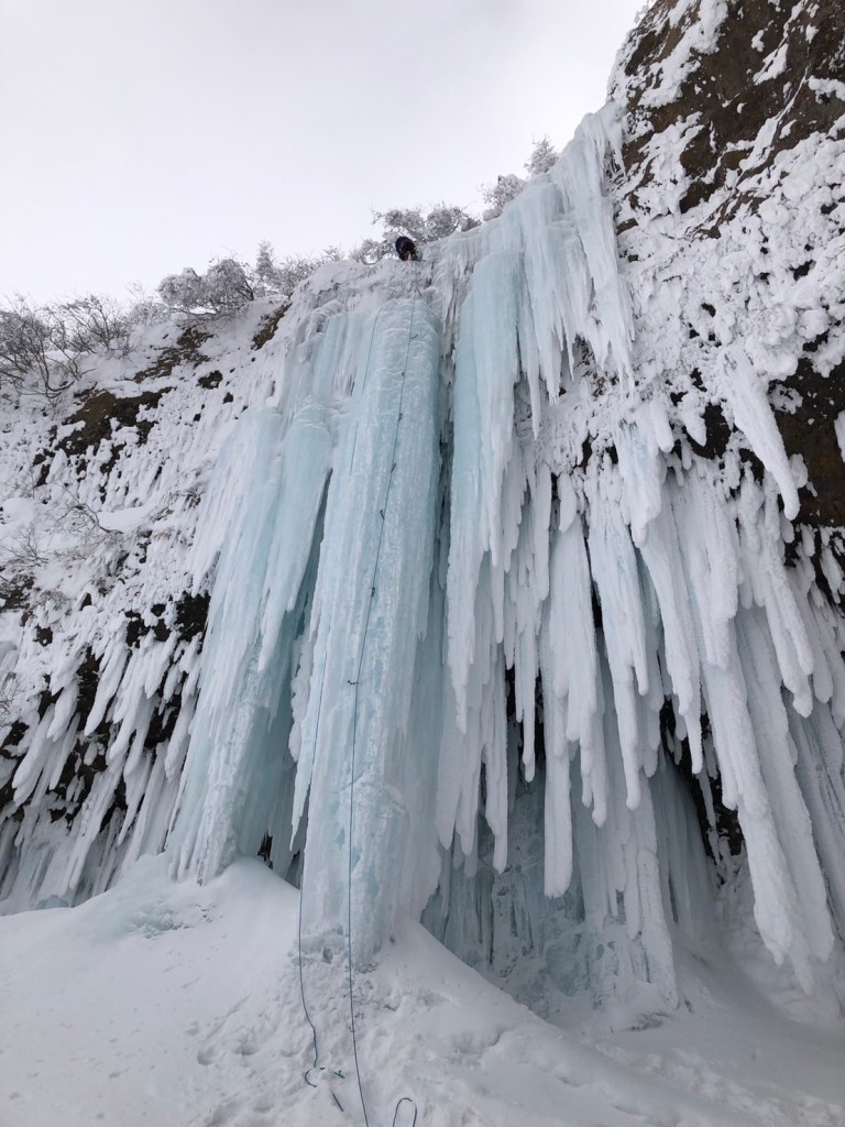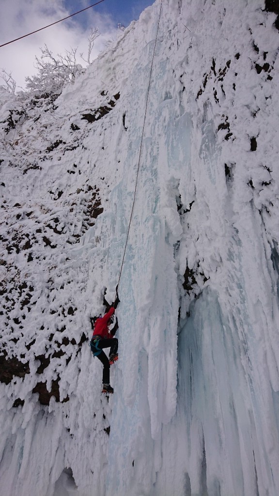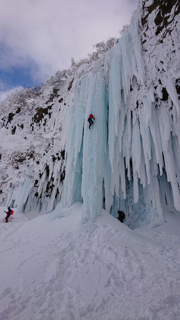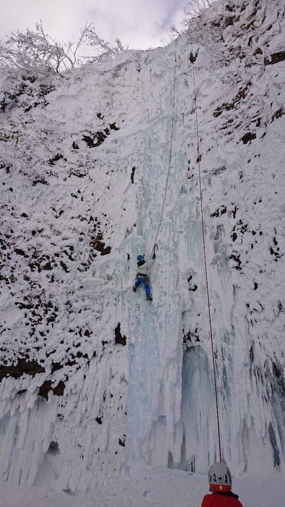 (工藤)大氷柱は最初は全く登れませんでしたが皆様からアドバイスを頂き腰を氷に近づけるようにしたら楽に登れるようになりテンションしながらですがトップアウトできたので良かったです。糸滝の上の滝は全く登れませんでしたので次回がんばりたいです。アックス持っていない私を連れて糸滝の上に行く為に、まりこさんと松本さんが糸滝をアックス1本で登って下さりました。皆様にお世話になり本当にありがとうございました。