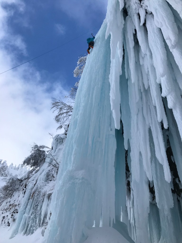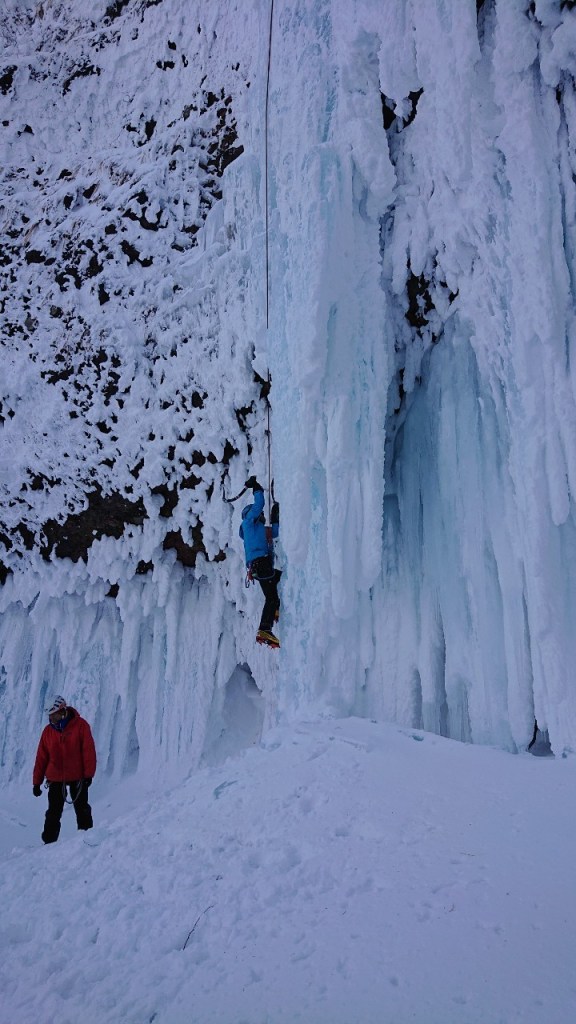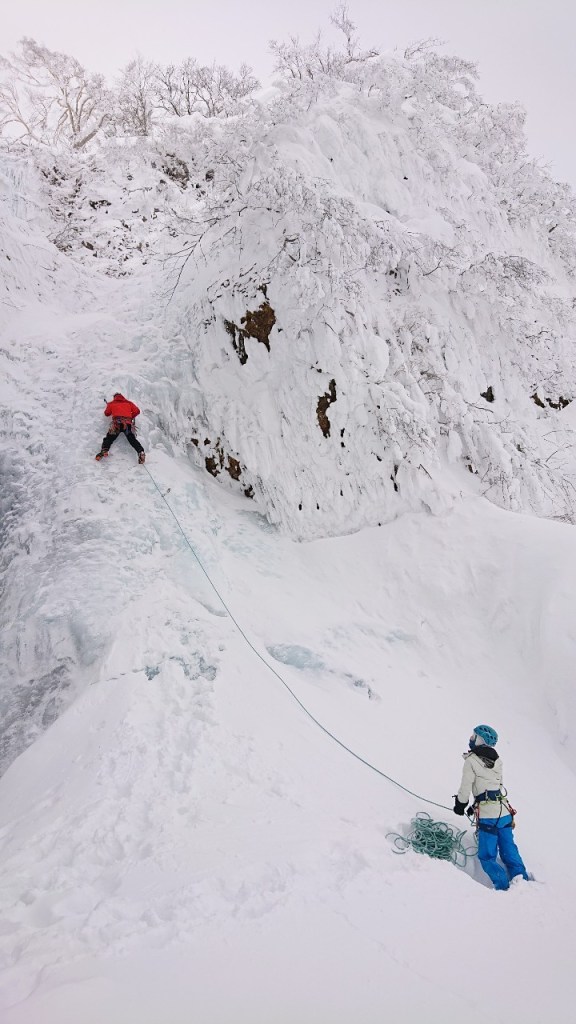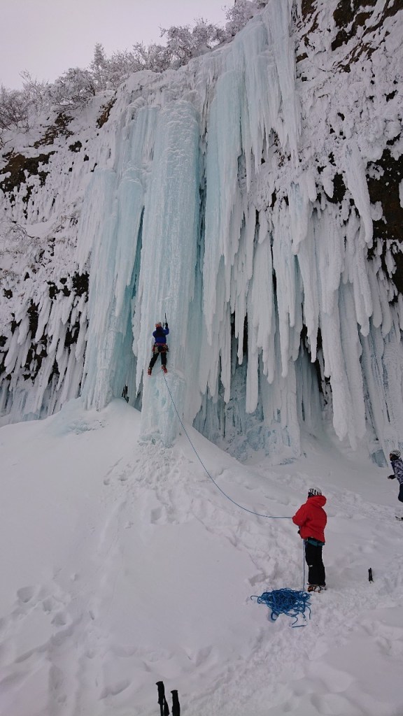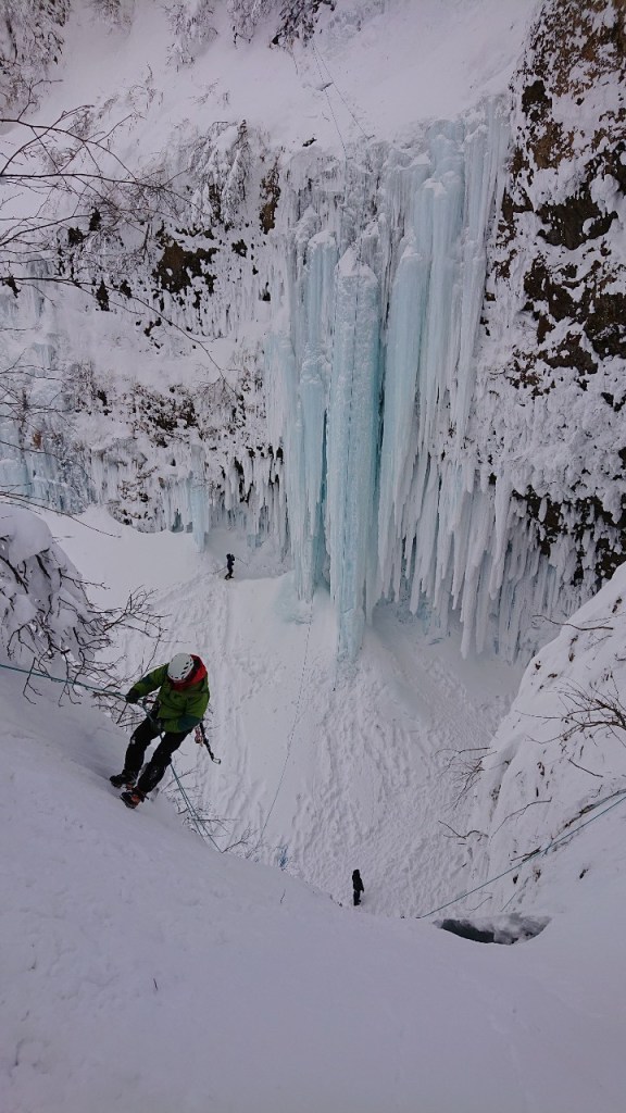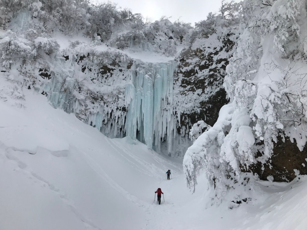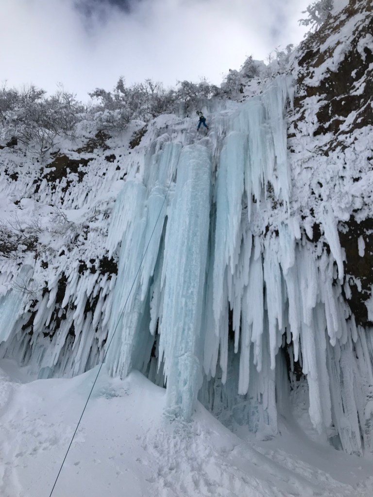 (工藤)大氷柱は最初は全く登れませんでしたが皆様からアドバイスを頂き腰を氷に近づけるようにしたら楽に登れるようになりテンションしながらですがトップアウトできたので良かったです。糸滝の上の滝は全く登れませんでしたので次回がんばりたいです。アックス持っていない私を連れて糸滝の上に行く為に、まりこさんと松本さんが糸滝をアックス1本で登って下さりました。皆様にお世話になり本当にありがとうございました。