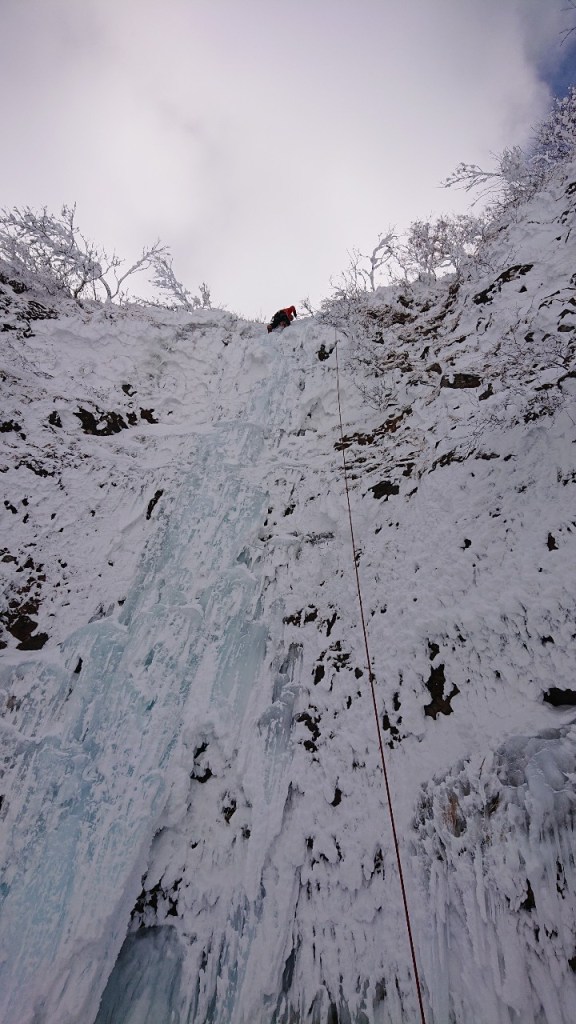 (山宮)大氷柱をリードしましたが、途中で疲れて上を向いたときに全然まだ先が長く「上までまだあるなー」と気持ちが折れてアックステンションして少し休んでしまいました。テンションした後は普通に上まで登りきれたので気持ちを強く持ってもう少し頑張れば良かったなーとは思いましたが、まだまだ弱いという事ですね。糸滝の上の氷瀑は出だしでスタンスが限定されて若干難しいですが、あとは問題なく登れました。最後のほうで右手のアックスの決めが甘く抜けそうになって左手のアックスを決めようと振りましたが氷が無く雪棚でアックスが決まらず焦りました。なんとか右手のアックスを決め直し(それでも甘い状態でしたが)左手のアックスが氷に届くところまでスタンスを上げて登れましたがフォールしそうで危なかったです。大氷柱はワンテンで宿題になりましたが、次は下までいつ繋がるかわからない糸滝の上の氷瀑をノーテンで登れて良かったです。