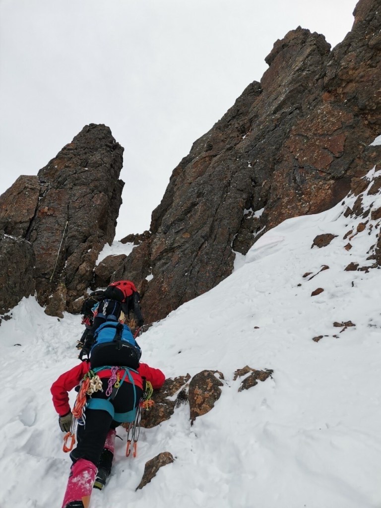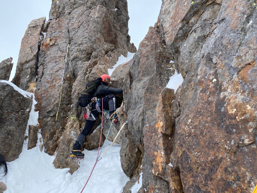 (銅谷)初見ルートでのトップでとても緊張しました。緊張からかチョックストーンの越え方に悩み時間を掛けてしまった。途中から吹雪いて来て、手もかじかんで寒さで体力をかなり消耗して疲れたけど冬のアルパインの厳しい楽しさが少し病みつきになりそうな感じ。トランシーバーを使った事でパーティー内での連絡がストレスなくスムーズに行われてよかった。