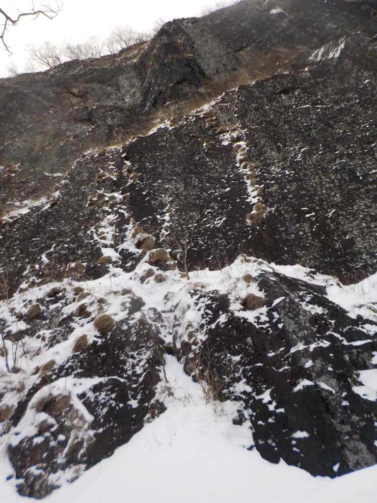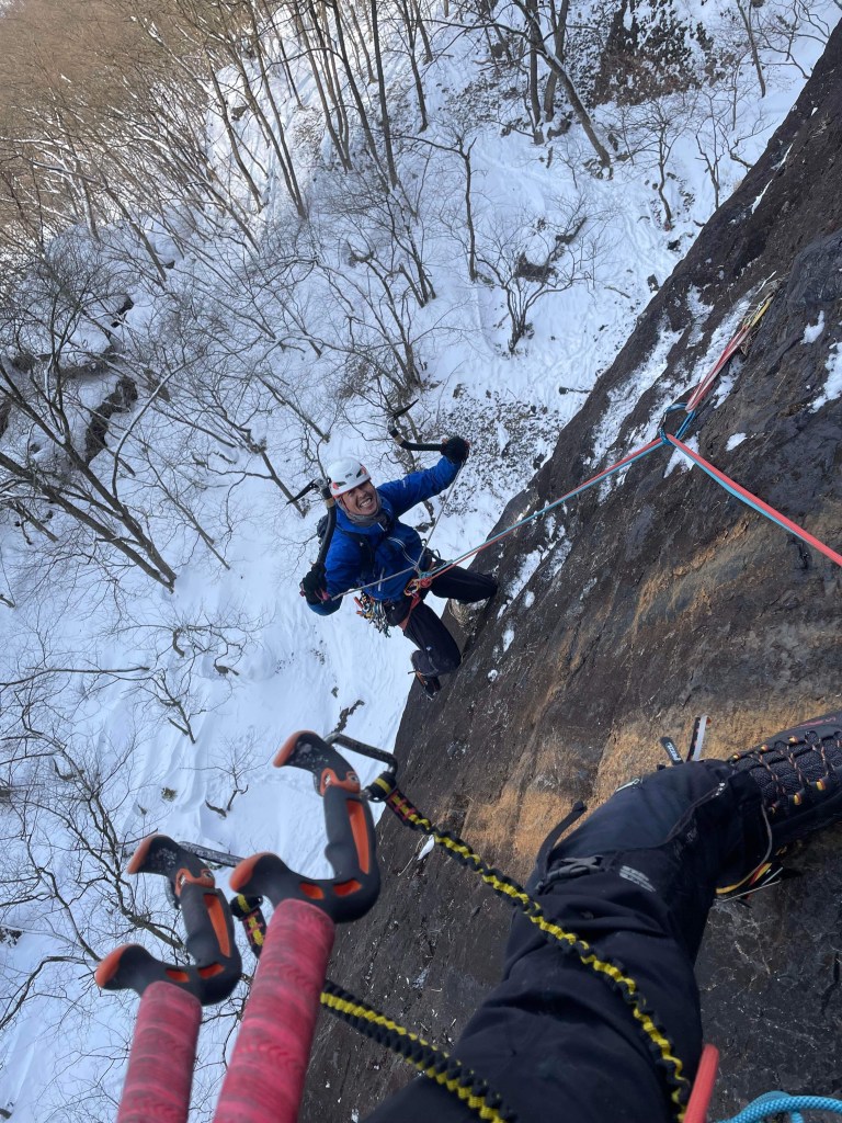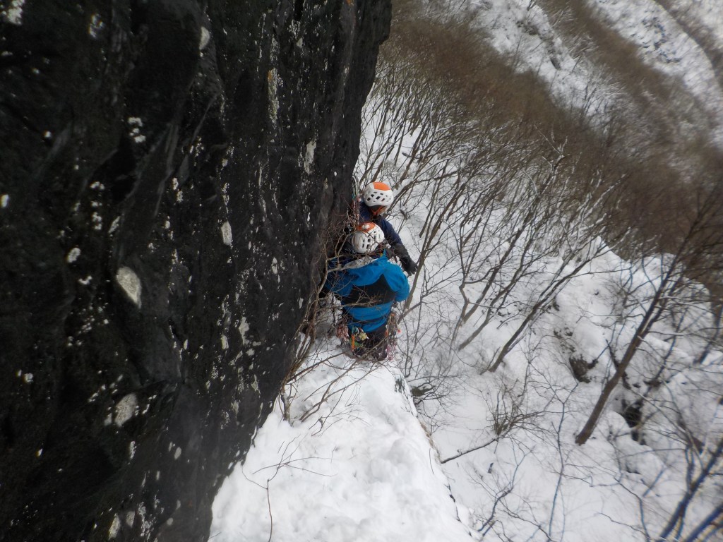 ・岩の上から終了点までの下りはクライムダウン。幅が狭く雪が滑るので気が抜けませんでした。