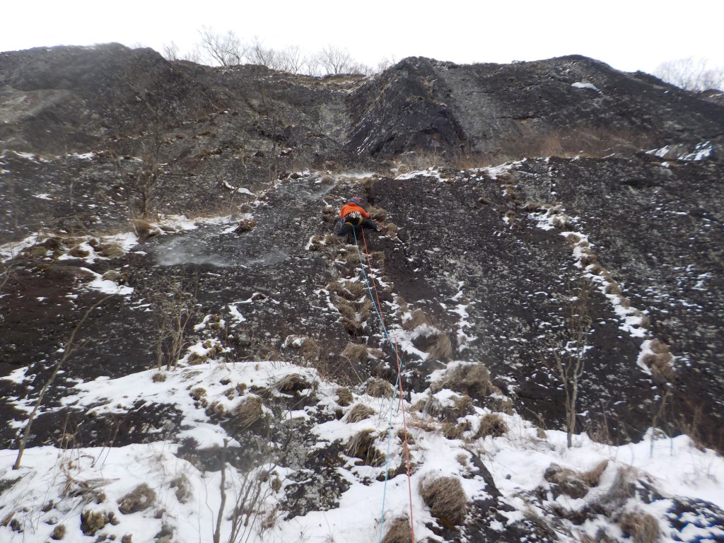 ・草付はバッチリ凍っていたのでアックスをしっかり決め、スタンスはステミングしながら少しづつ高度を上げていきました。
