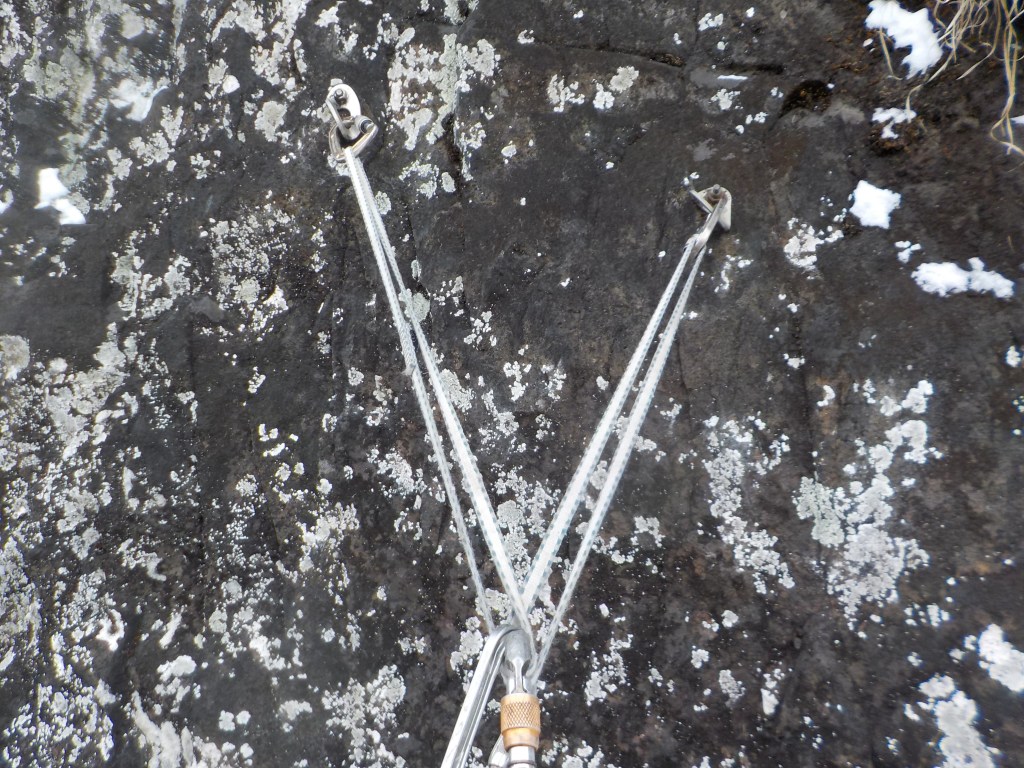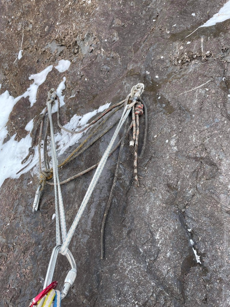 ・先行パーティーが除雪してくれたので良かったですが雪が付いていると嫌な感じの歩きになります。途中の灌木で2箇所ランナーを取りました。