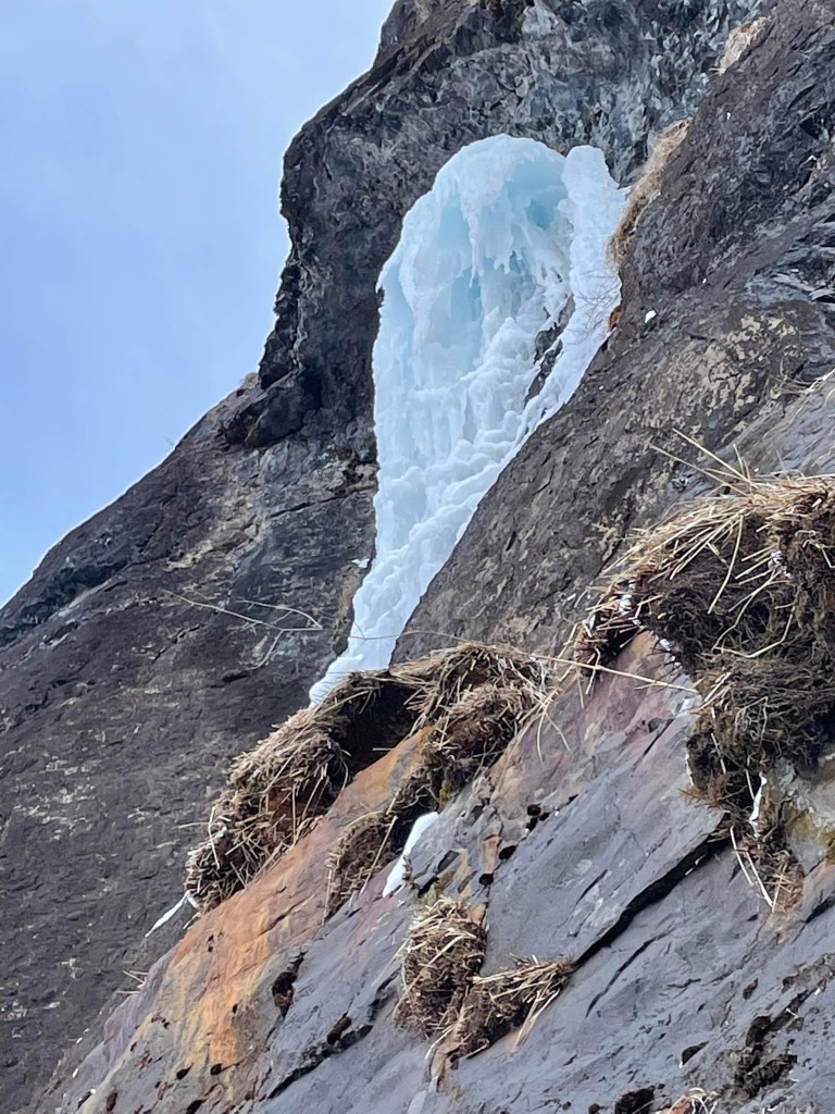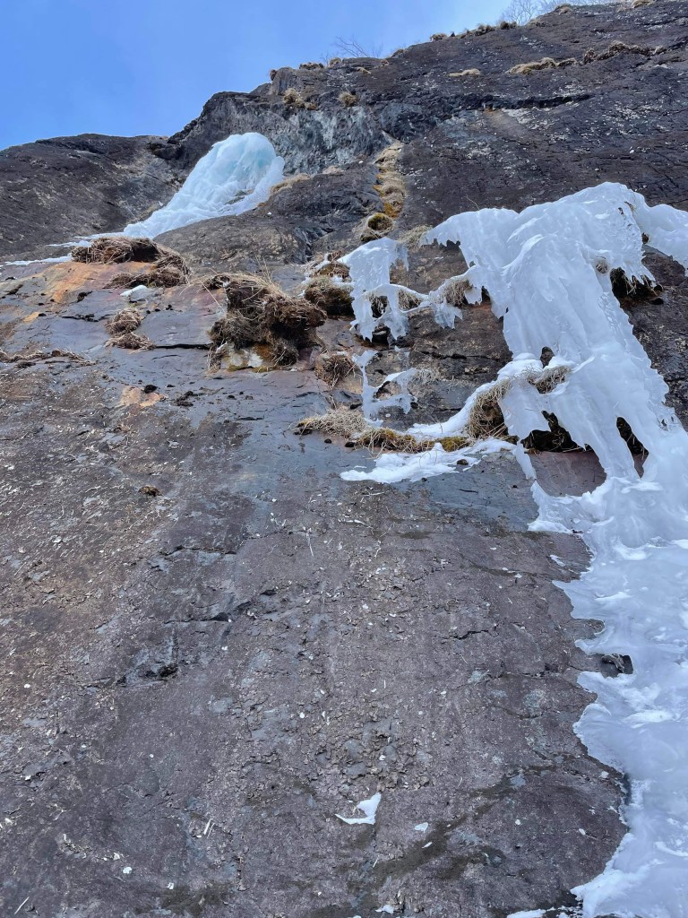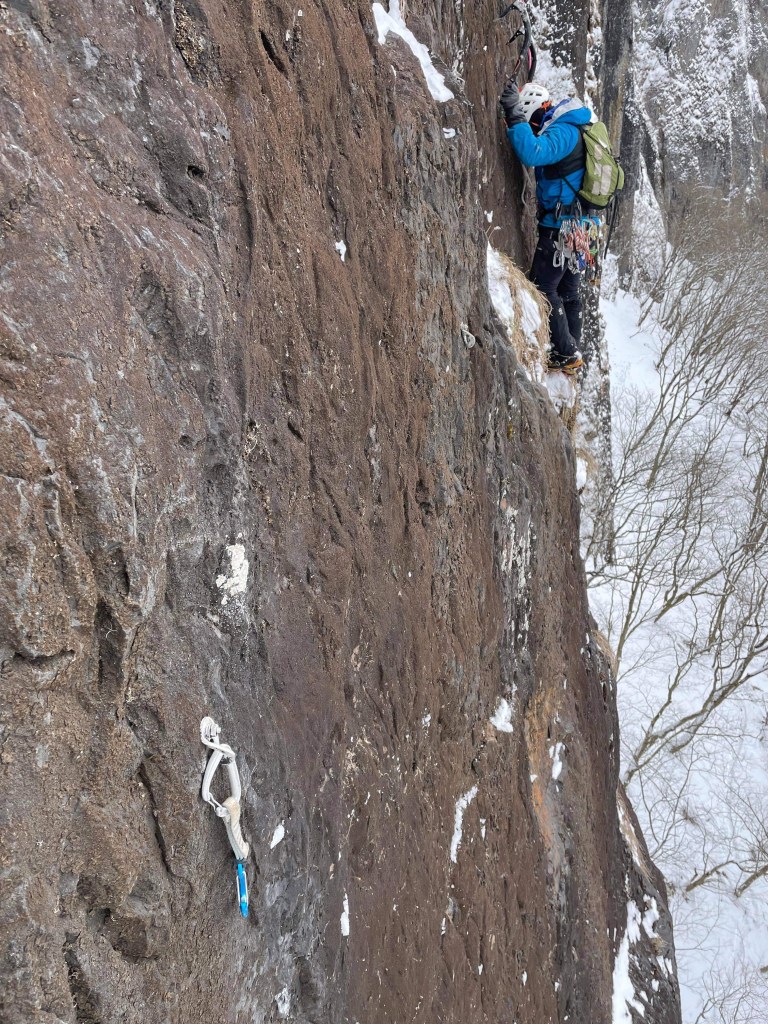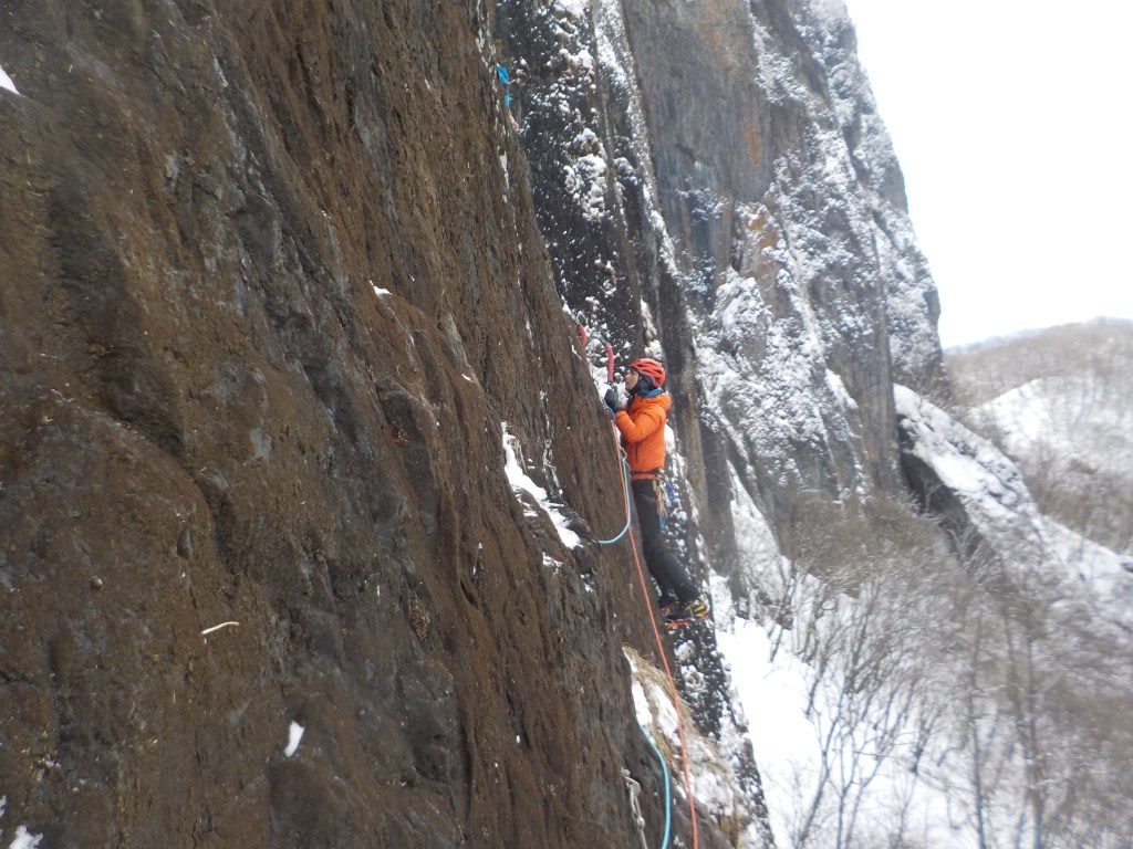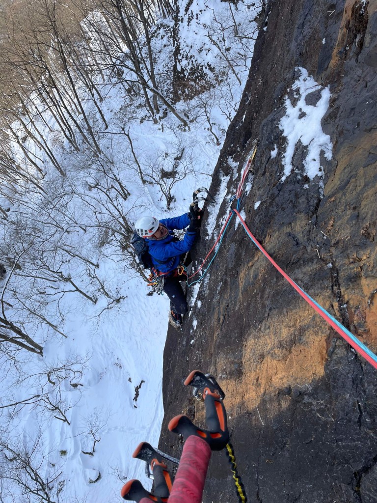 ・雪の付いたところを探せばフッキングできる場所はありスタンスも細かいですがそれなりにあったので何とかB4本目までのトラバースはフォールせずに行けました。(フッキングは棚の小さいかかり、アックスの刃先ぐらいの岩の溝、サイドで利かすクラック等バリエーション豊富でした。)
