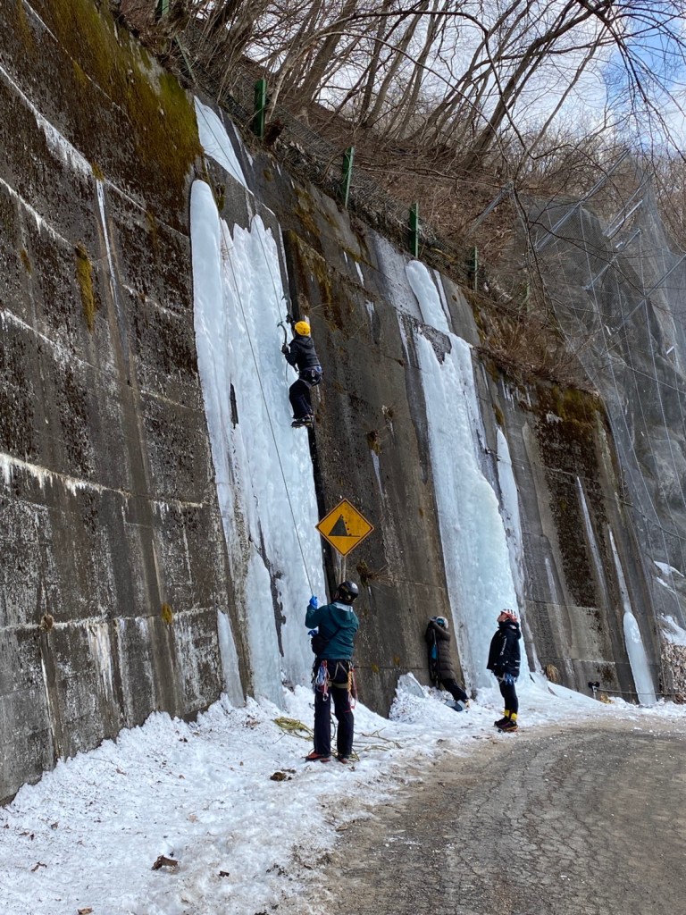 (高橋)アイスデビューでした。みなさんの指導のおかげで少し登る事が出来ました。アックスが氷に刺さる感触はやみつきになりそうです。