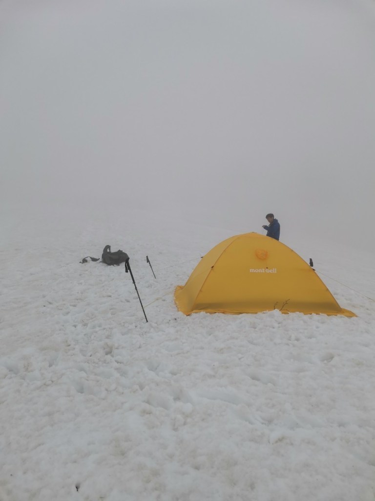 (工藤)雪の状態もとても良く、トレースもしっかりとついていて特段難しい箇所も無く、ひたすら見たことの無い絶景の中を登る事が出来ました。ただ、最後の雪壁は少し雪が緩んでピッケルが利きづらい所がありました。また、大雪渓の下山がとても怖くて私だけかなりの距離をクライムダウンしとても疲れました。今回は白馬尻に幕営しましたが、全歩荷では私の足腰ではかなり厳しかっただろうと思いました。山宮会長からピッケルの使い方や下山の歩き方等々多くの事を学ばせて頂きました。山宮さん、高橋さん本当にありがとうございました。