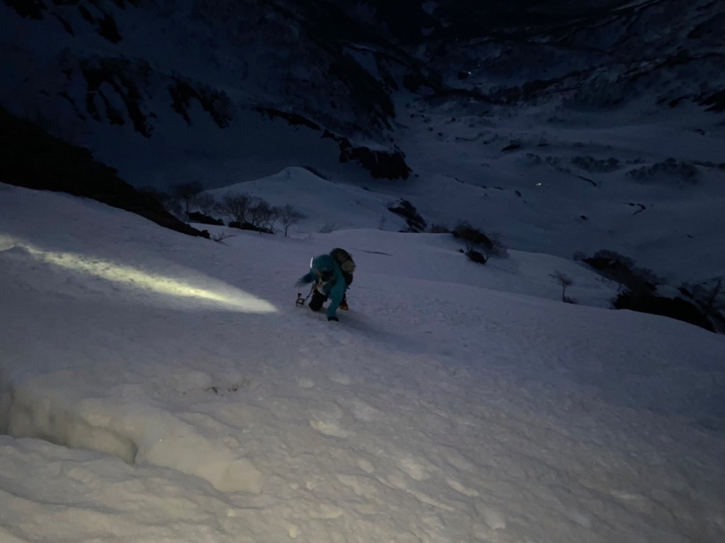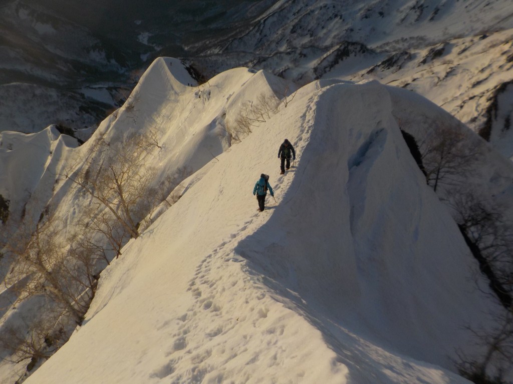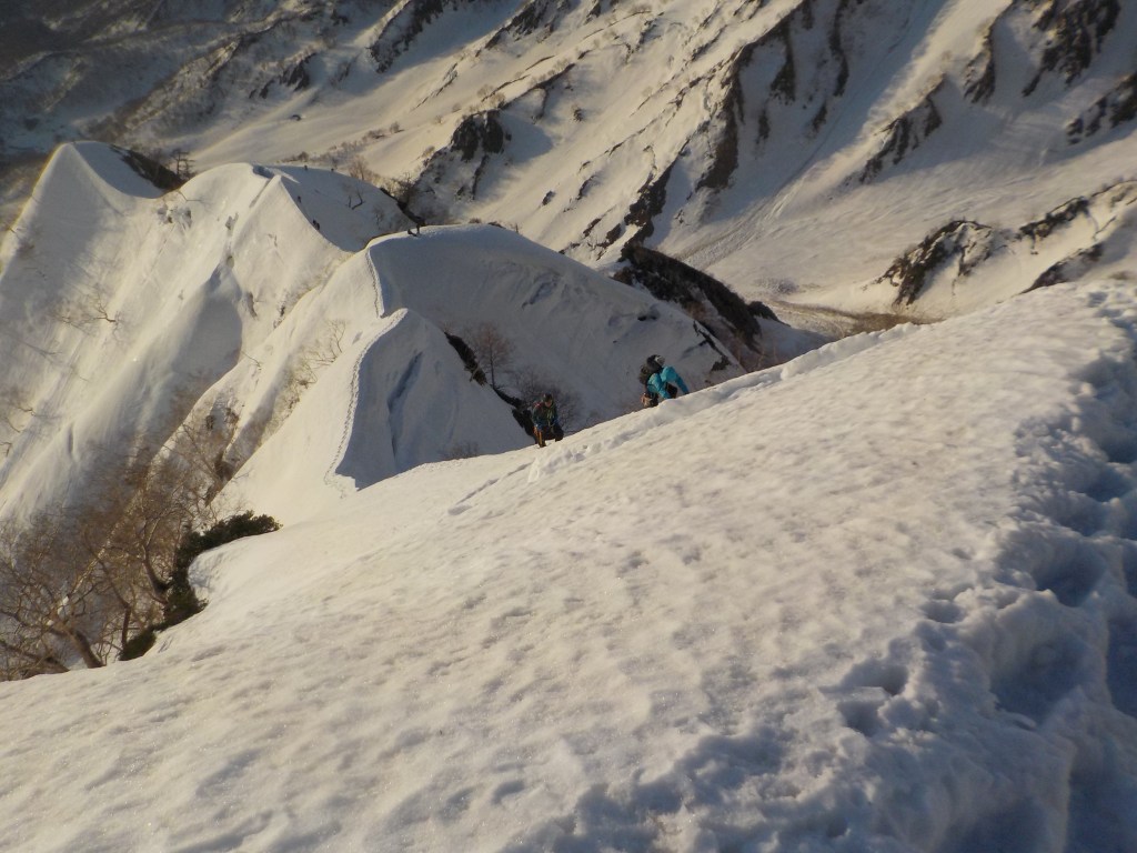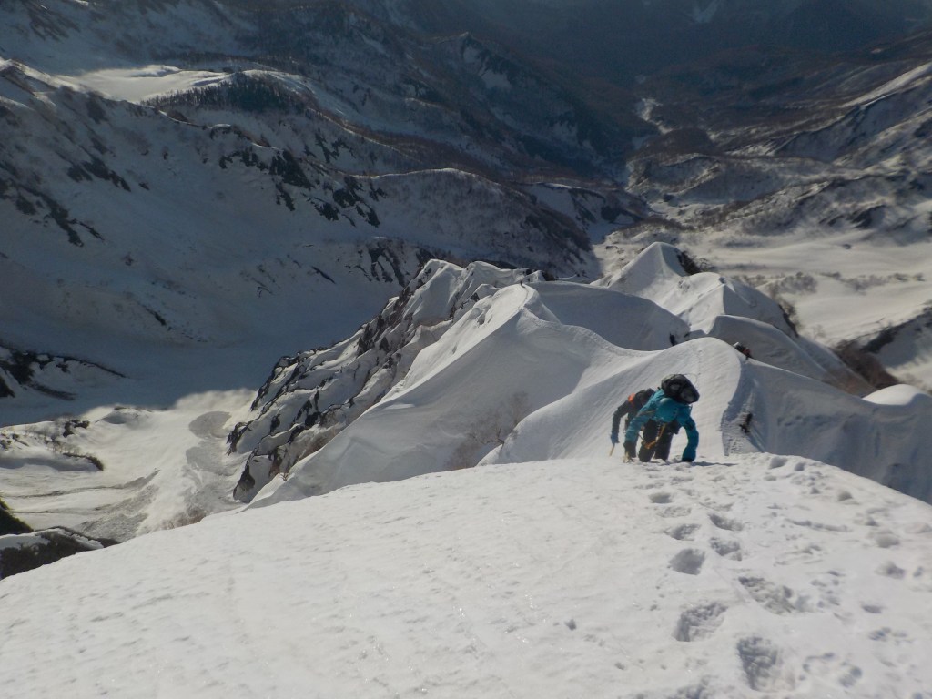 (高橋)明け方の冷え込みのおかげで雪の状態が良かった事、先行者のトレースがしっかりついていた事も重なり良い状態で登攀することが出来ました。山宮さん、工藤さんありがとうございました。課題として体力向上と、会山行等で学んだ技術を活かして、レベルの高い山への個人山行にチャレンジしていきます。