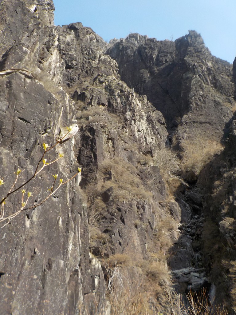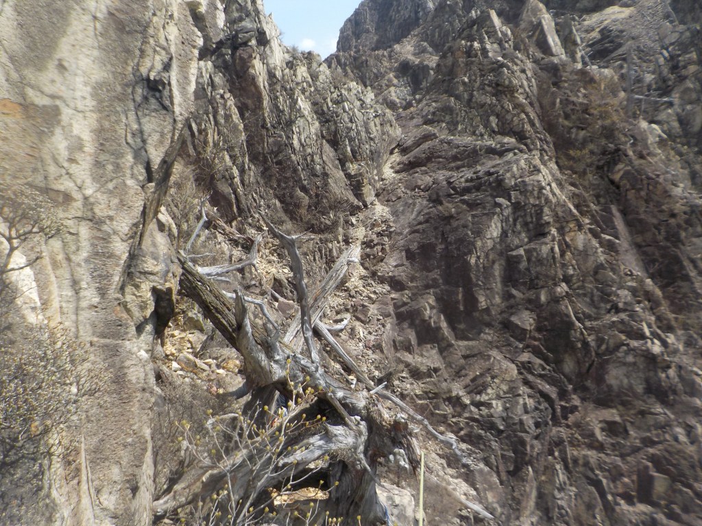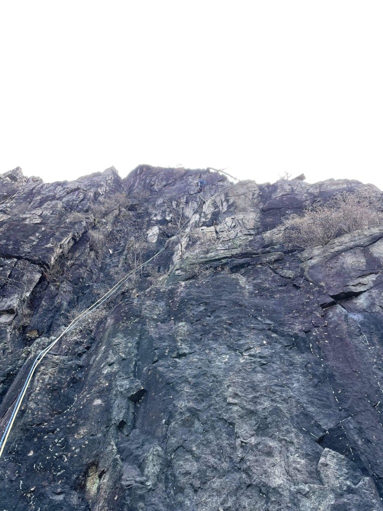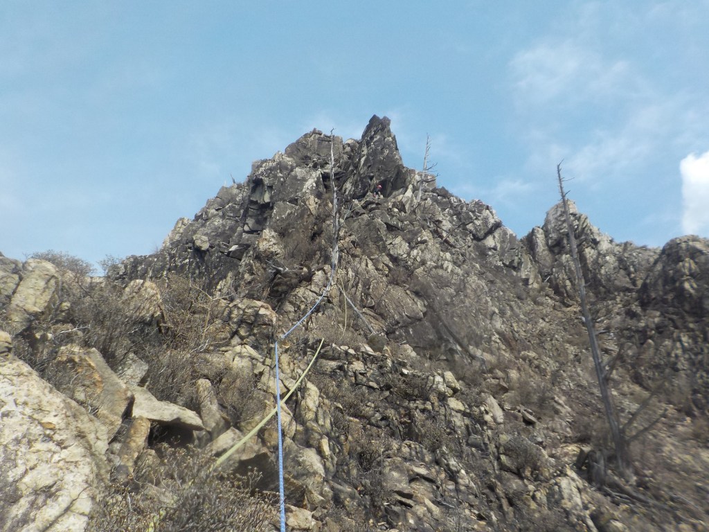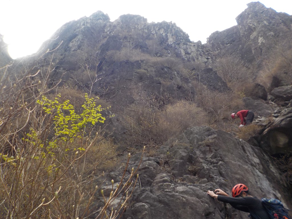 ・右上に見えている枯れ木を目指してフェースを右へ登っていきます。(正面は岩が脆く危ないです。)枯れ木は左から回り込みましたが邪魔で登りにくかったです。