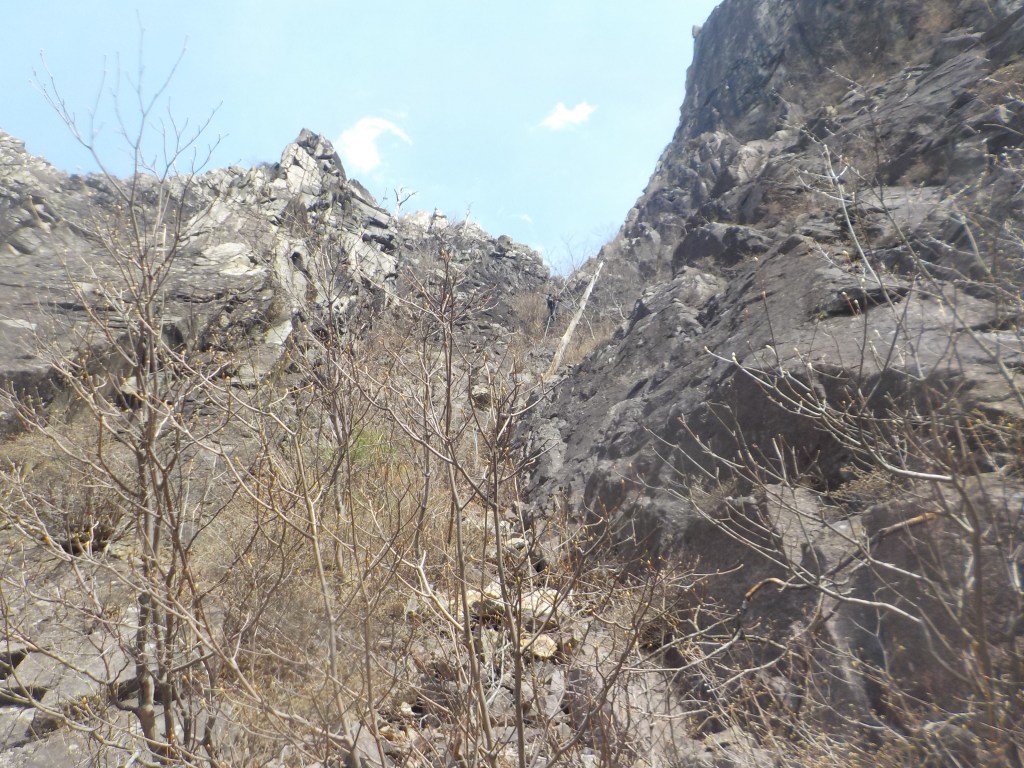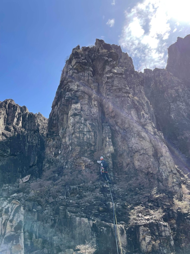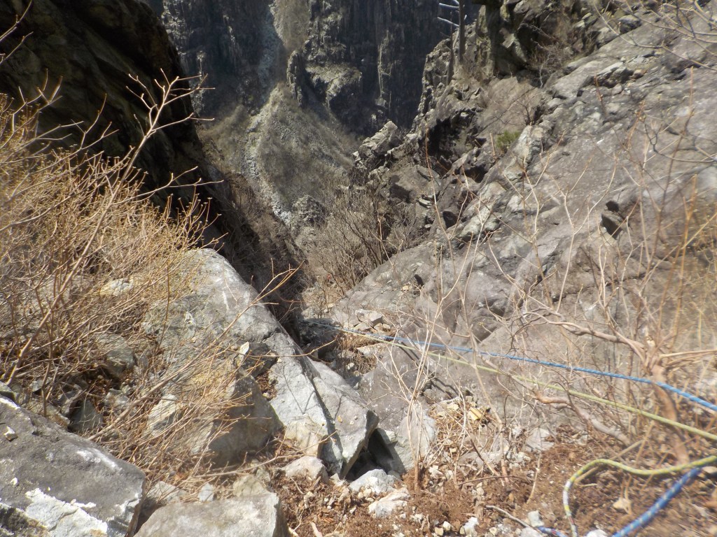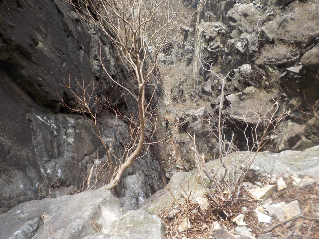 ・懸垂下降2回目のところで3番手で私が下りたときに縦横150cmぐらいのチョックストーンに乗ったら岩が動き挟まっていたのが外れて落石が起こりました。幸い下の2人には落石は当たりませんでしたがダブルロープ1本に当たってロープが損傷しました。(損傷したロープはカットしましたが、残りの懸垂下降ではロープ長が足りていたのでそのまま下れました。)
